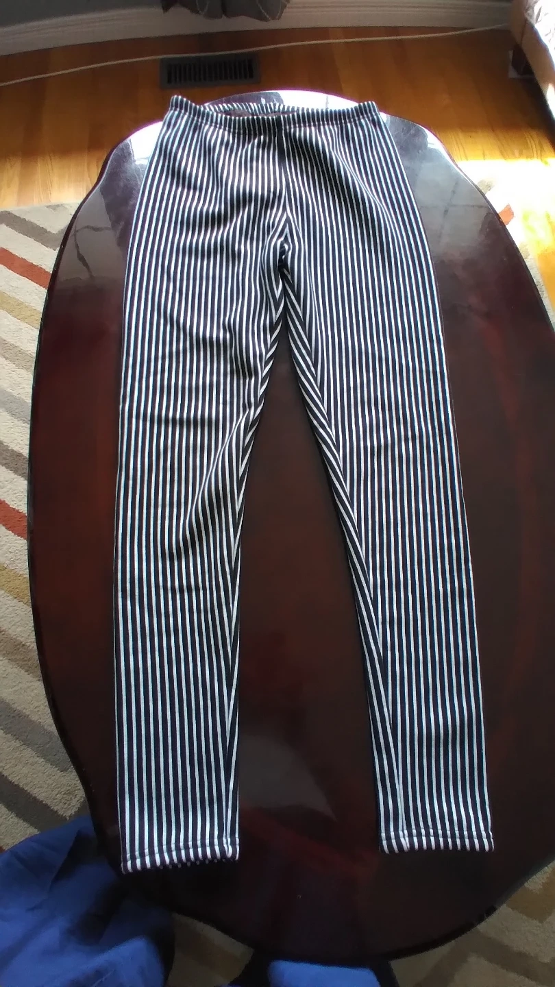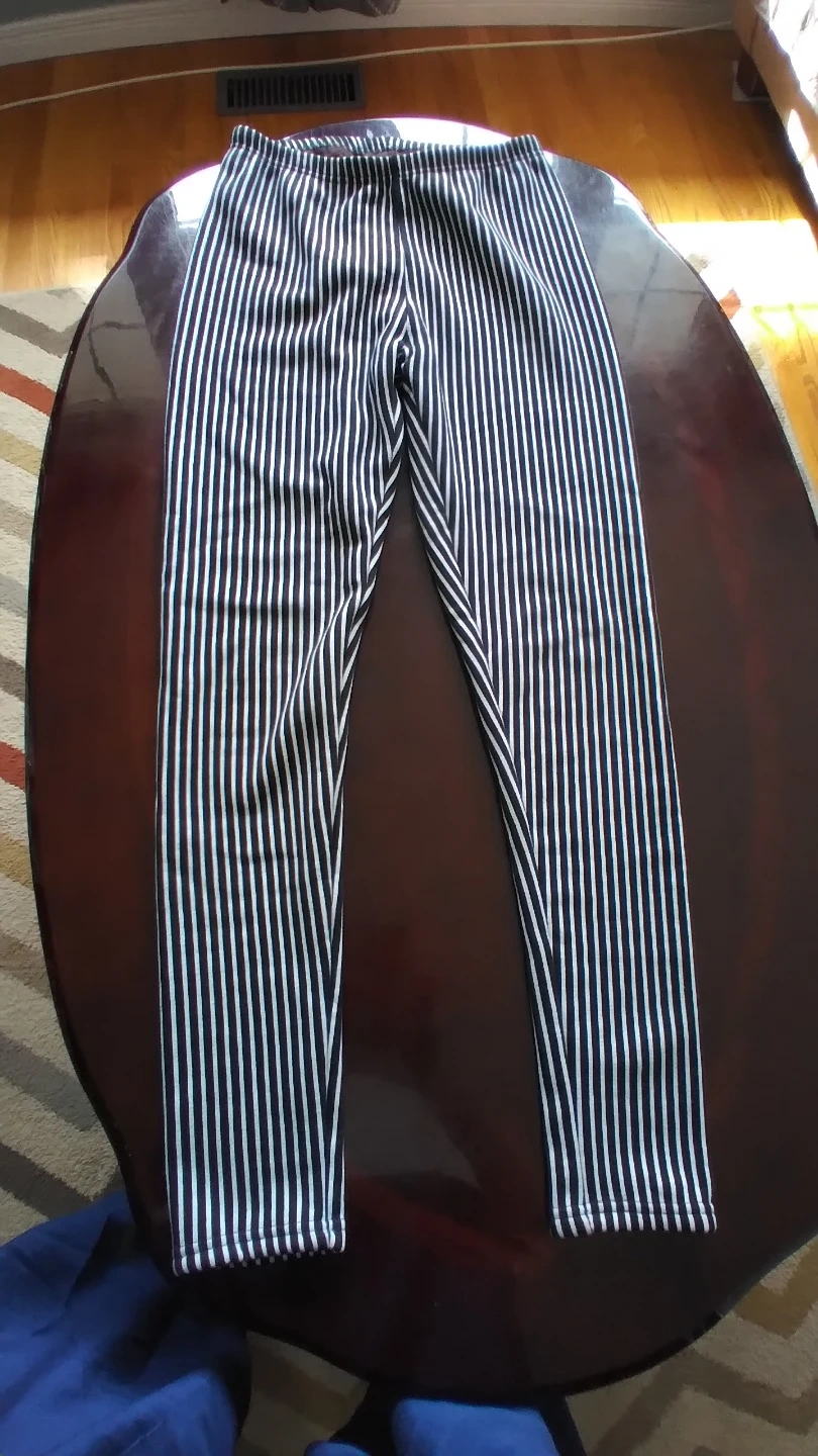 Cozy fleece-lined leggings with a black and white vertical stripe pattern. Made from a blend of 90% polyester and 10% spandex for a comfortable stretch. Perfect for staying warm on cooler days!