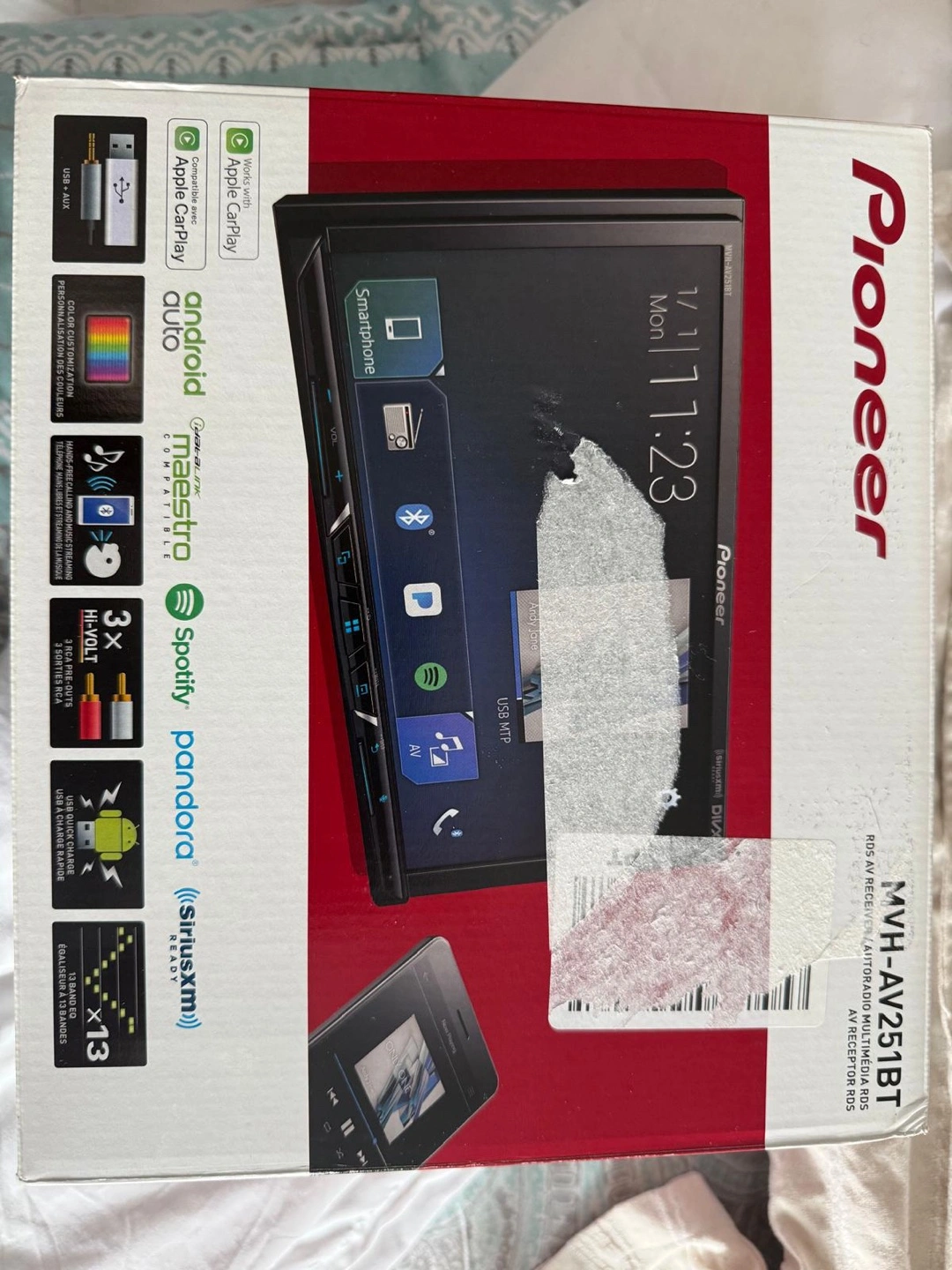Selling a Pioneer MVH-AV251BT car stereo receiver in excellent condition! It's compatible with Apple CarPlay and Android Auto, making it super easy to connect your smartphone. Features Bluetooth connectivity for hands-free calling and audio streaming. The box is included!
