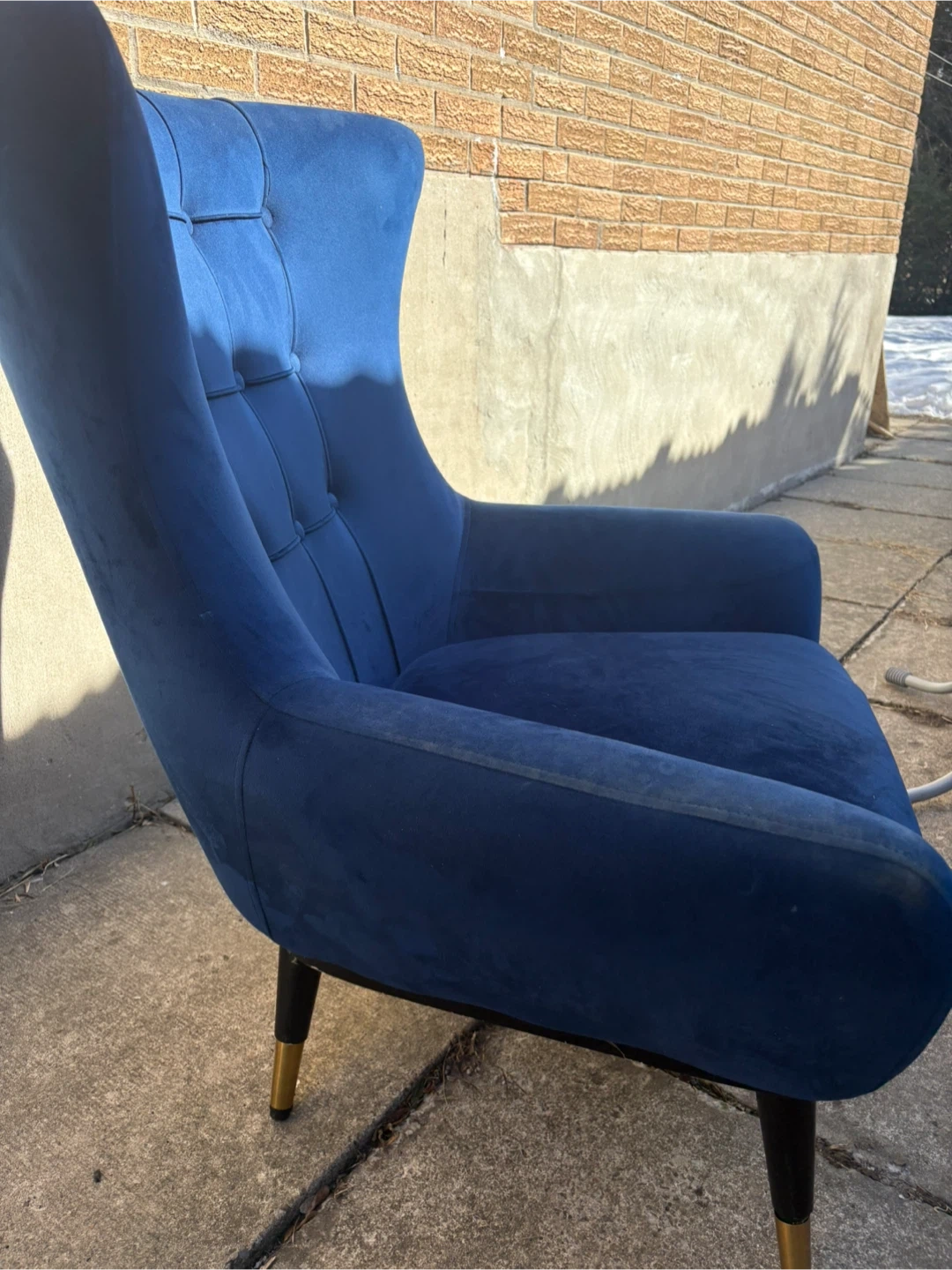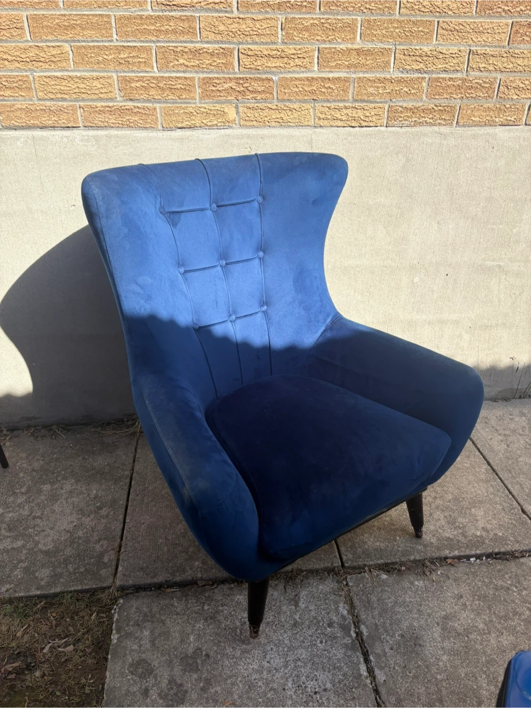 Stylish blue velvet accent chair with tufted back detailing. It features black tapered legs with gold accents. Upholstery is a soft velvet fabric.