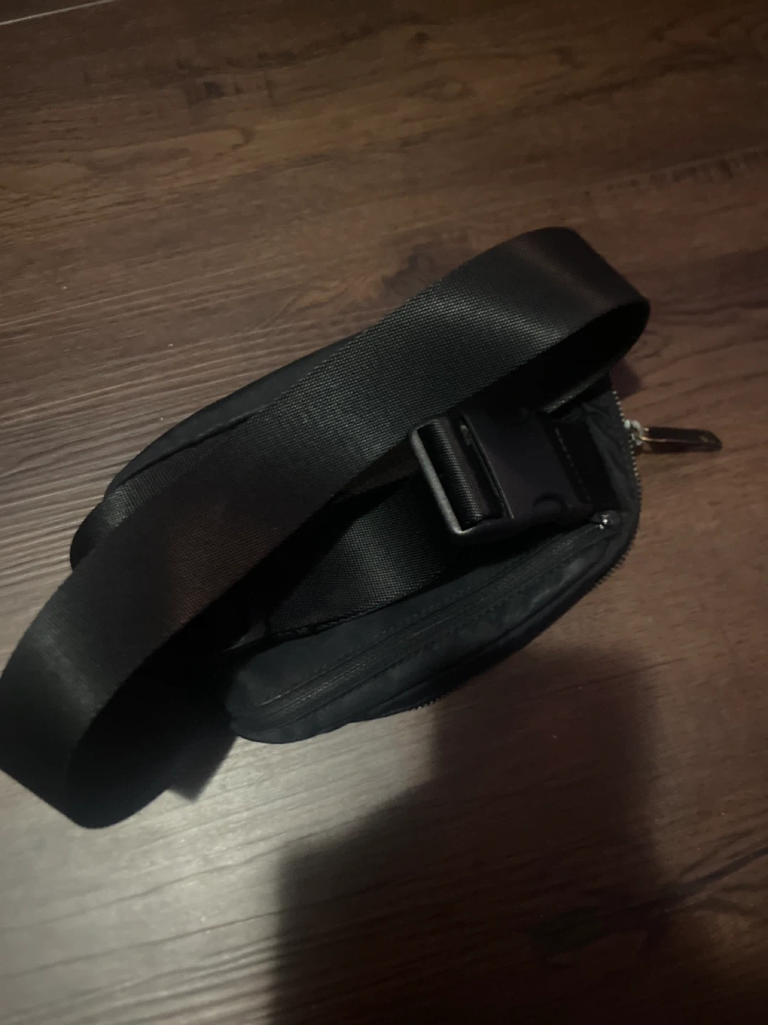 Black Lululemon Everywhere Belt Bag. It has multiple compartments inside for organization. Perfect for carrying essentials on the go!