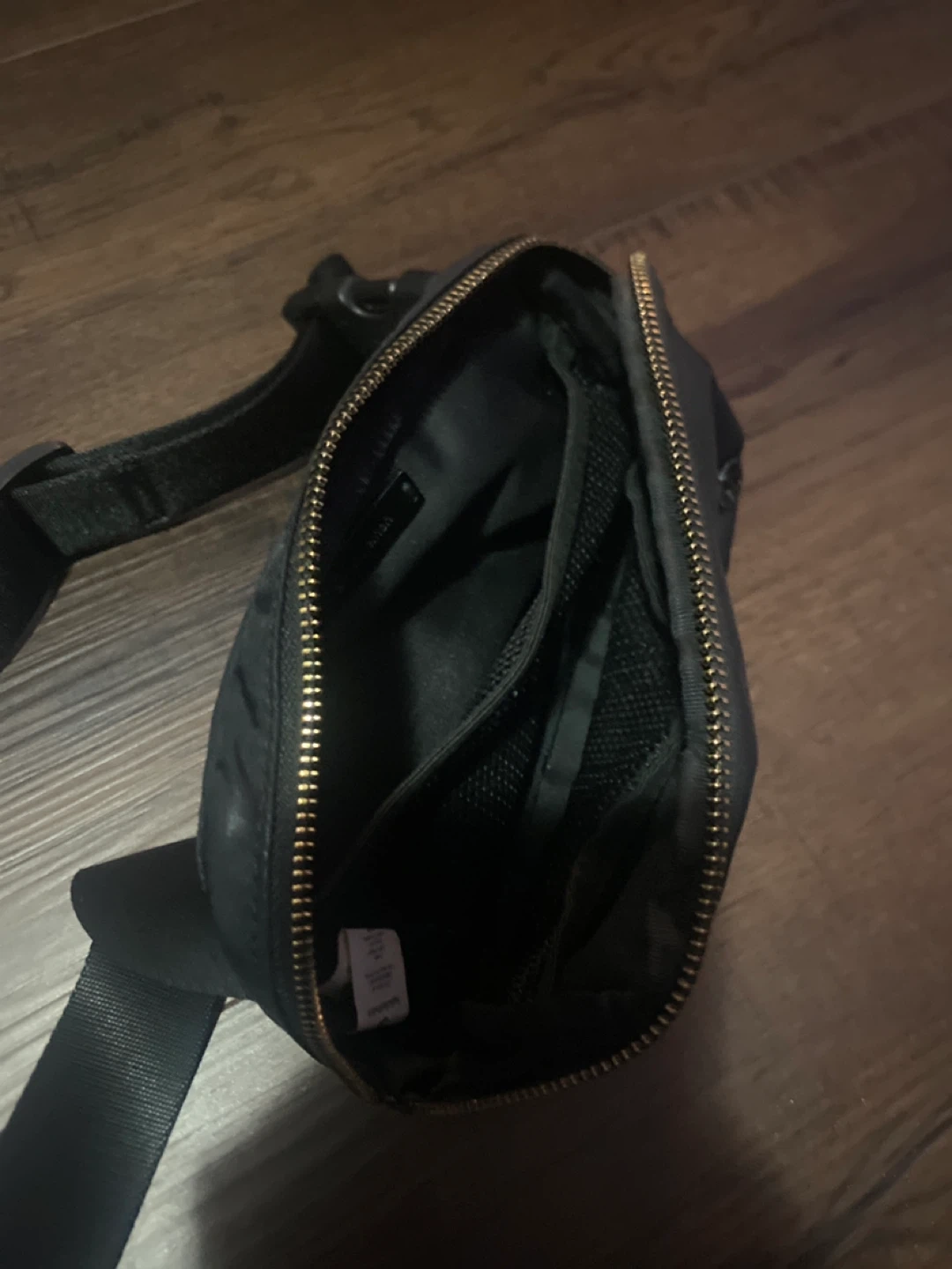 Black Lululemon Everywhere Belt Bag. It has multiple compartments inside for organization. Perfect for carrying essentials on the go!
