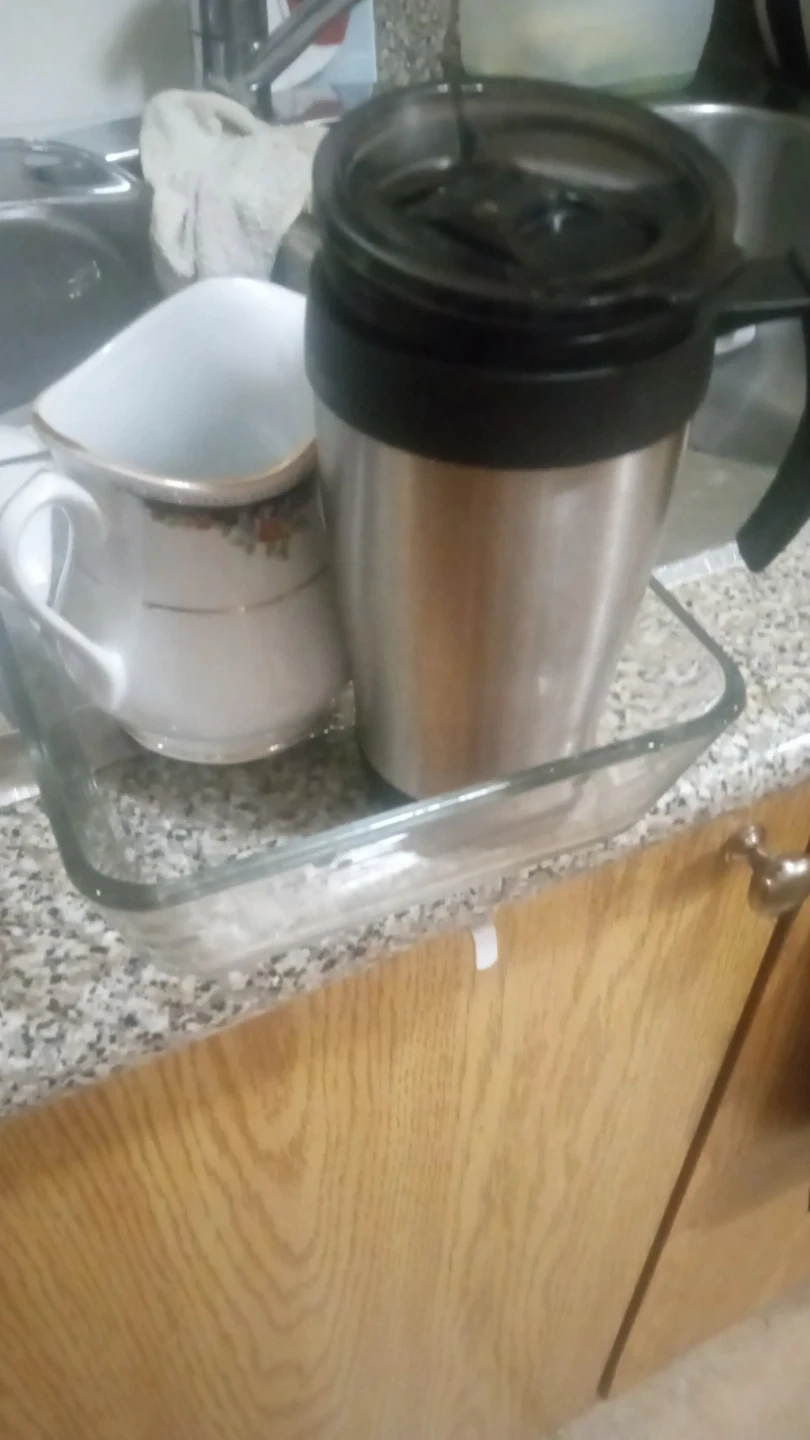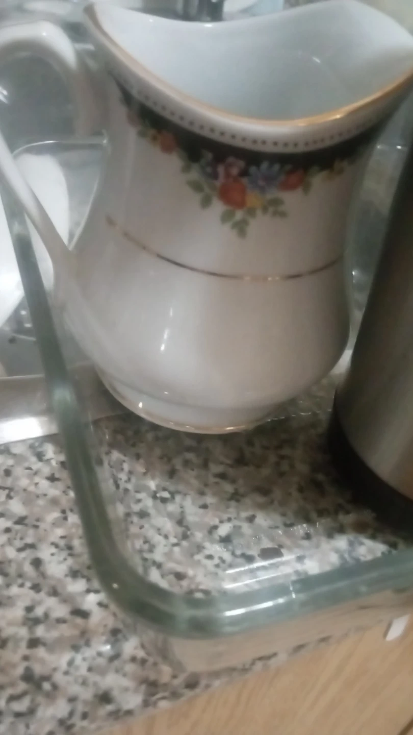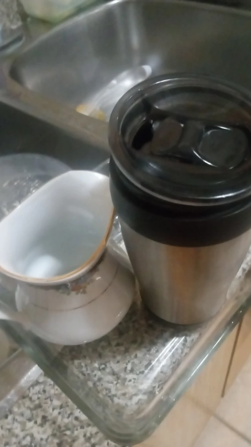 Travel mug with a stainless steel body and black lid. It has a handle for easy carrying. Creamer pitcher with floral design also included. This set is great for serving or taking drinks on the go!