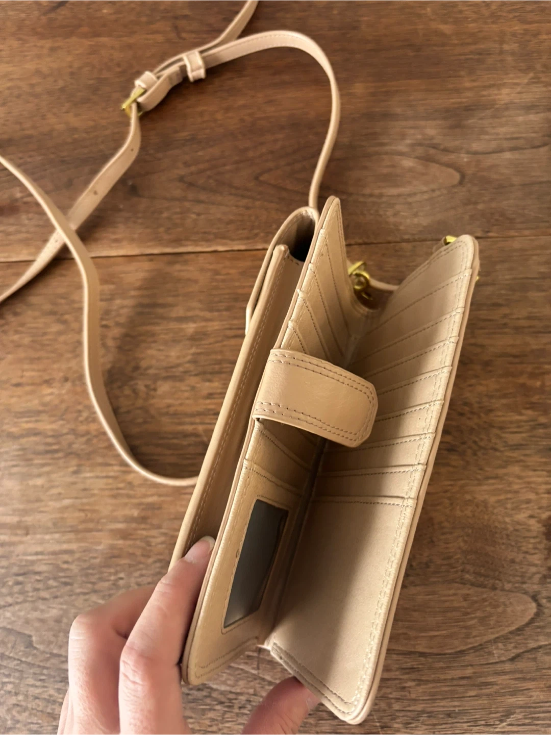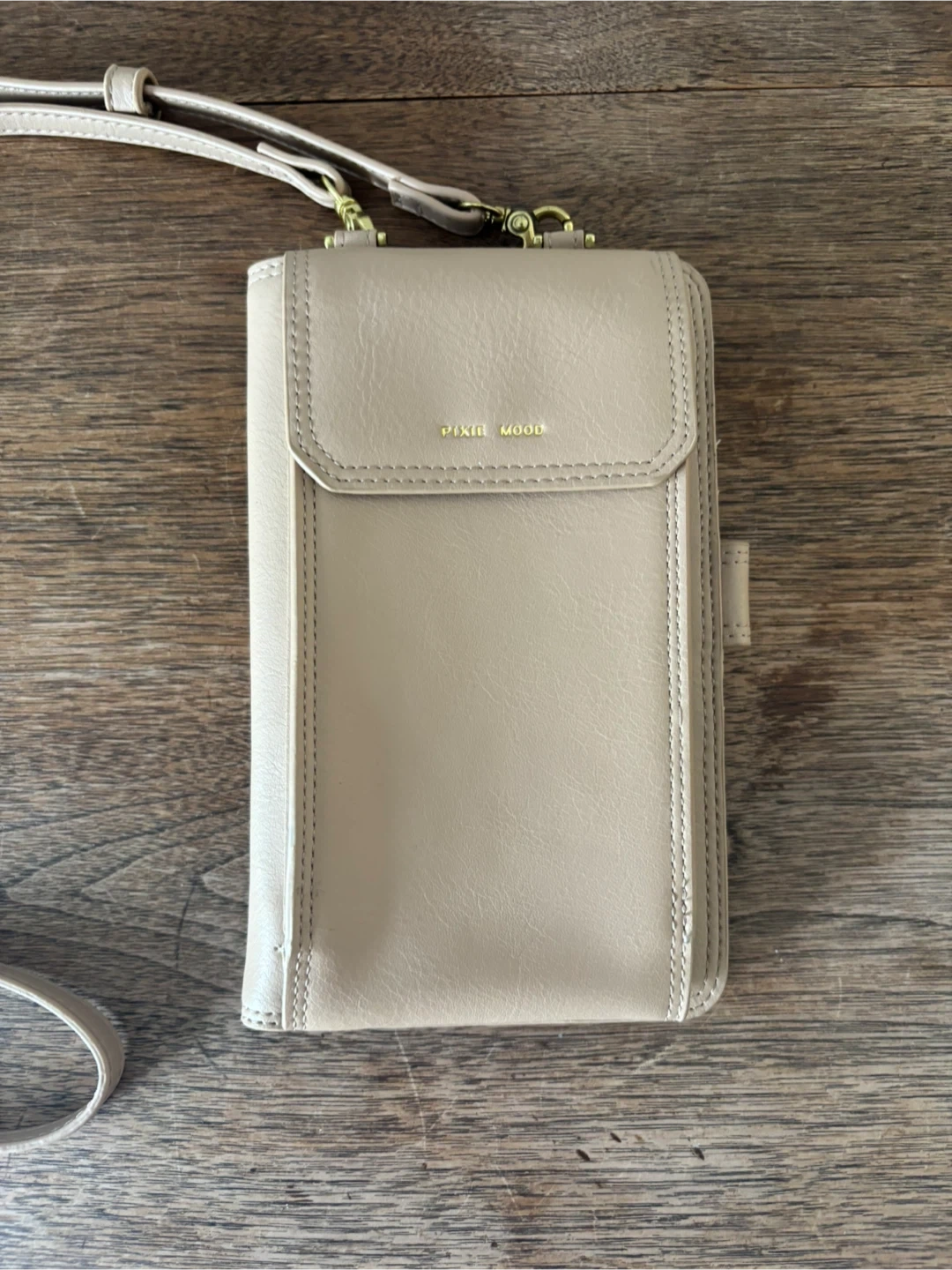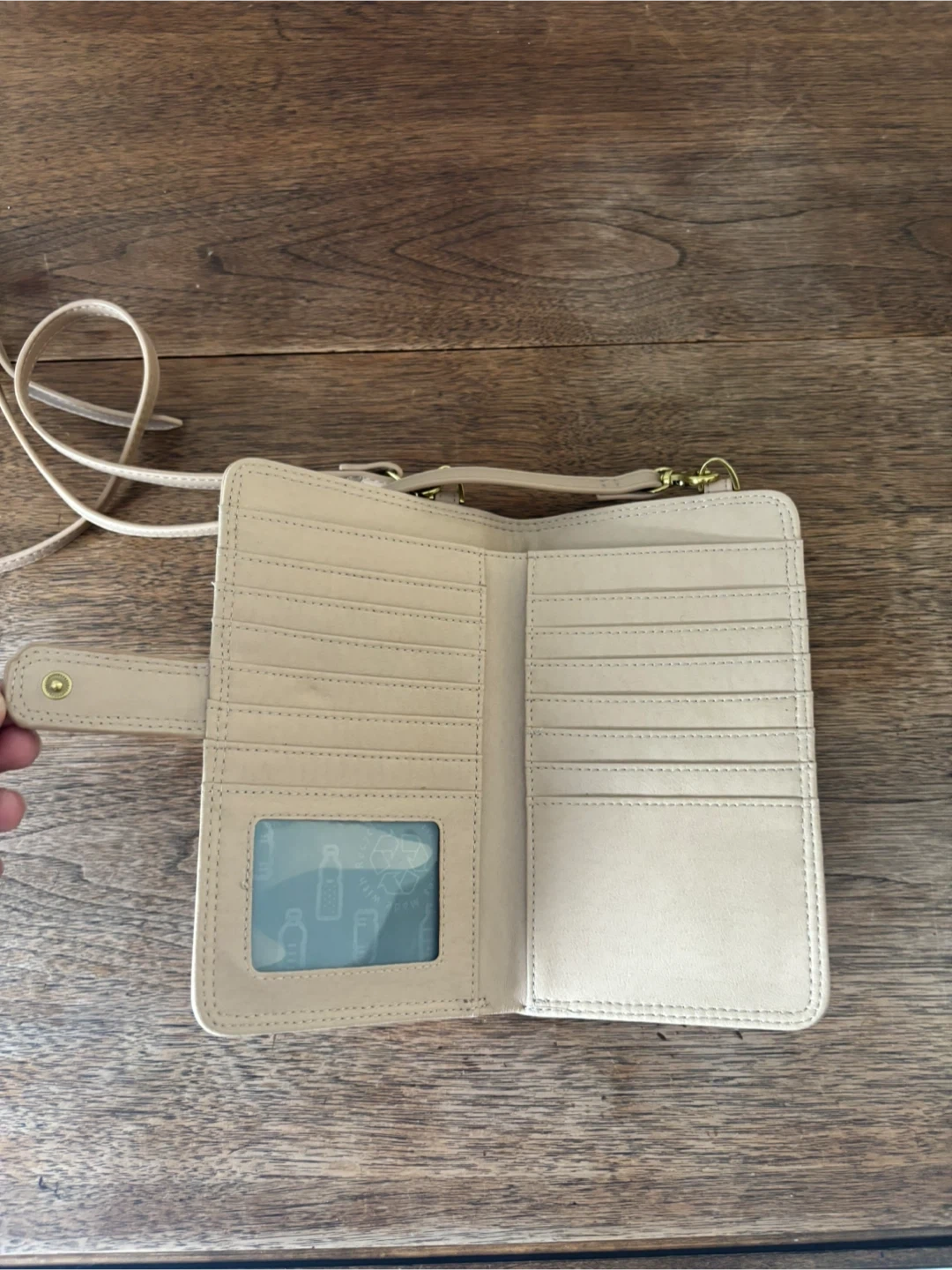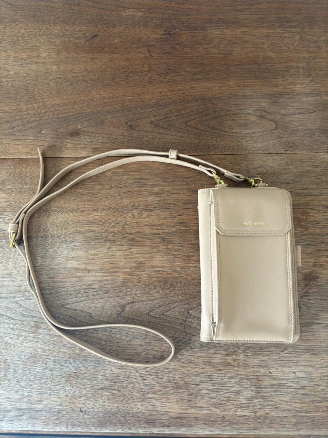 This Pixie Mood crossbody wallet is a light pink colour. It's made from faux leather and has multiple card slots inside. It also features a zippered compartment for coins or other small items. Brand new as I never used it. Cash only.