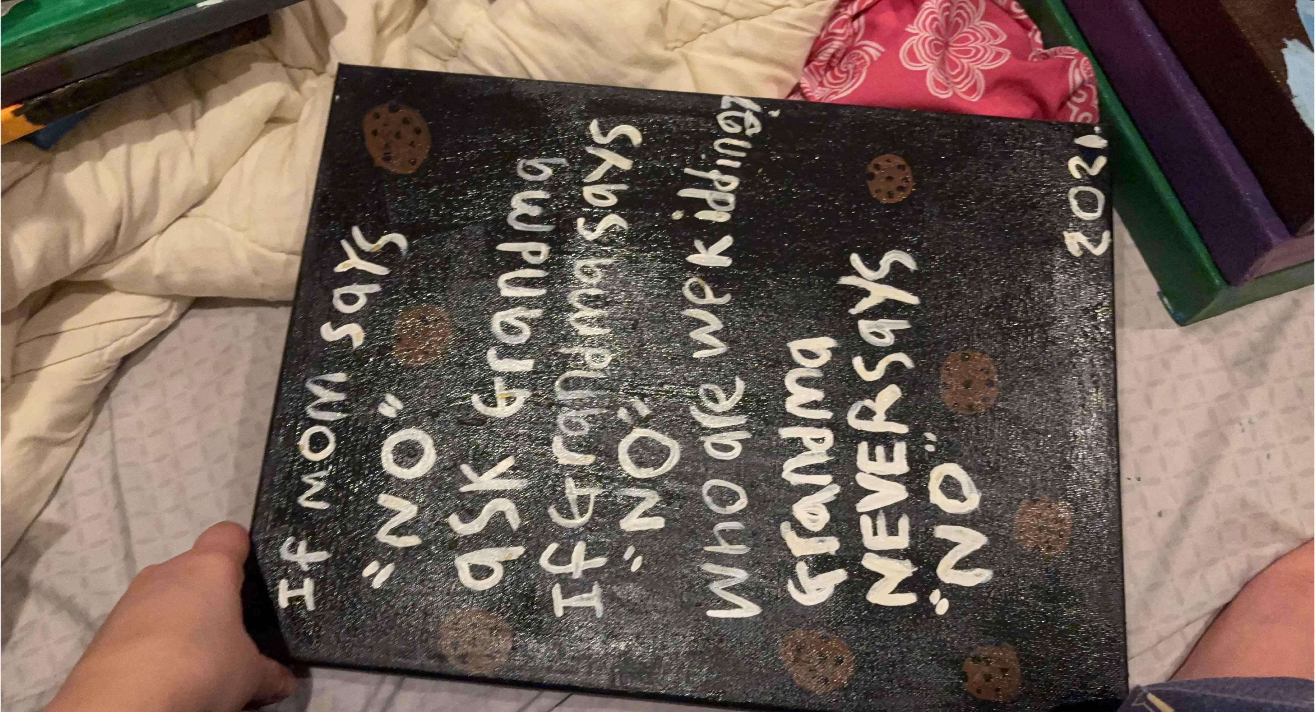 Handmade canvas art with a cute saying: "If Mom says 'No,' ask Grandma. If Grandma says 'No,' who are we kidding? Grandma NEVER says 'No'" with little cookie accents. Dated 2021.