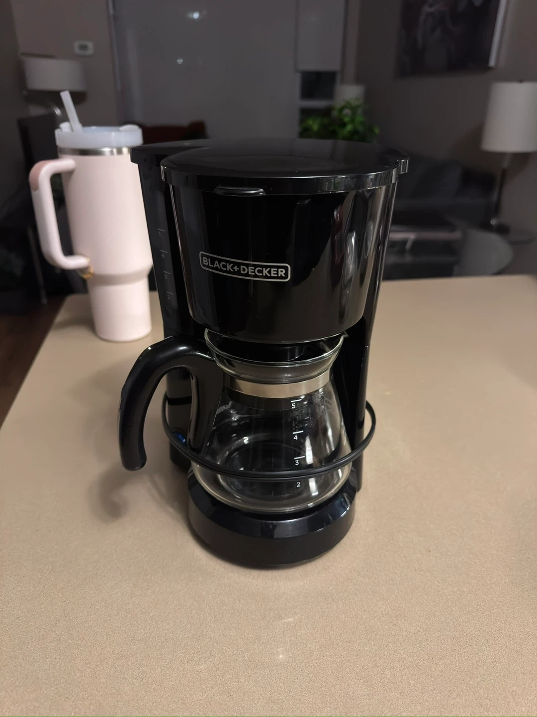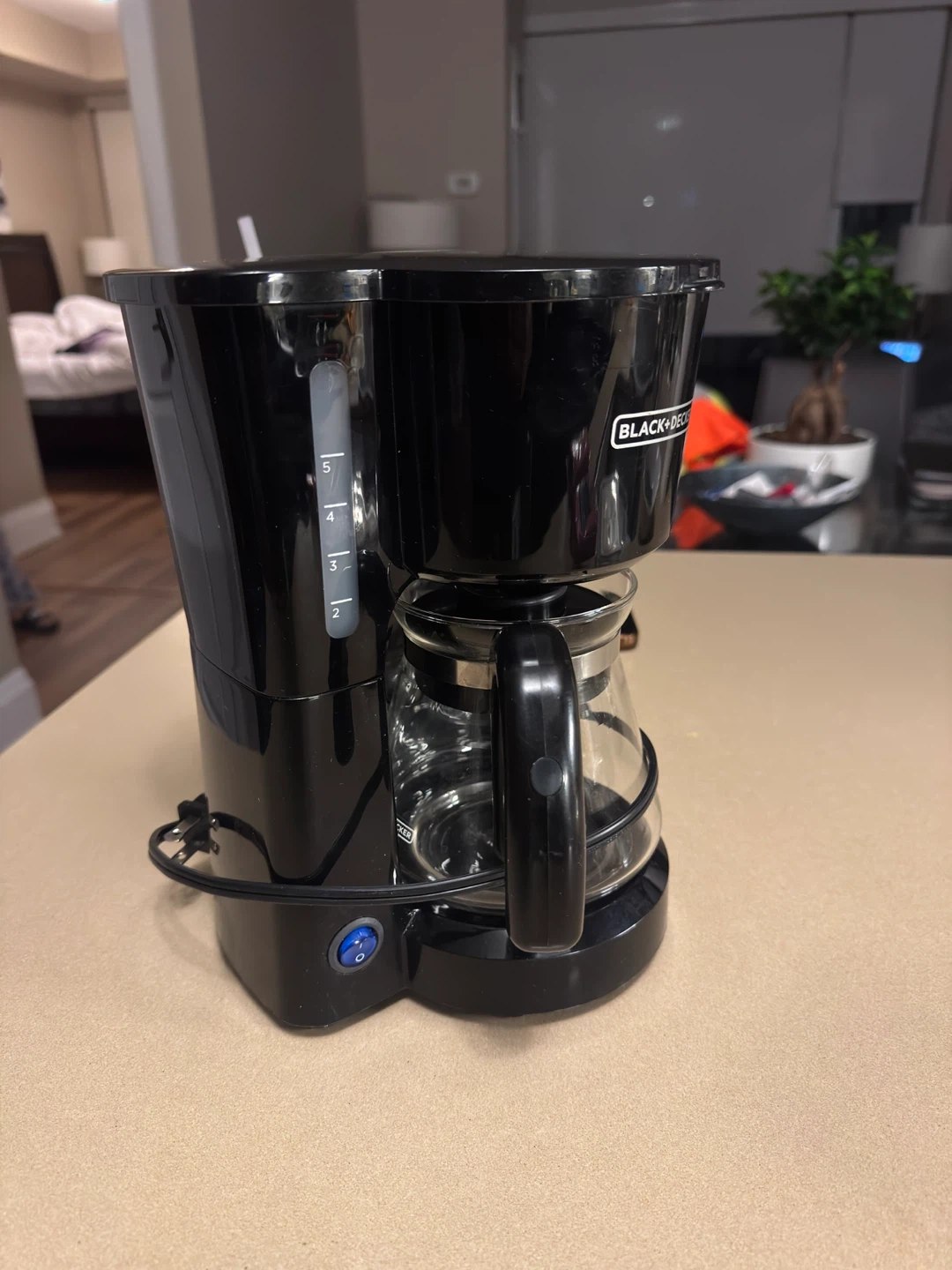 This is a Black+Decker 5-cup coffee maker. It's black and has a glass carafe. It's great for making a fresh pot of coffee in the morning!