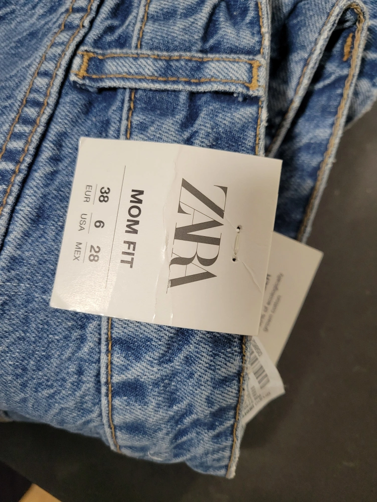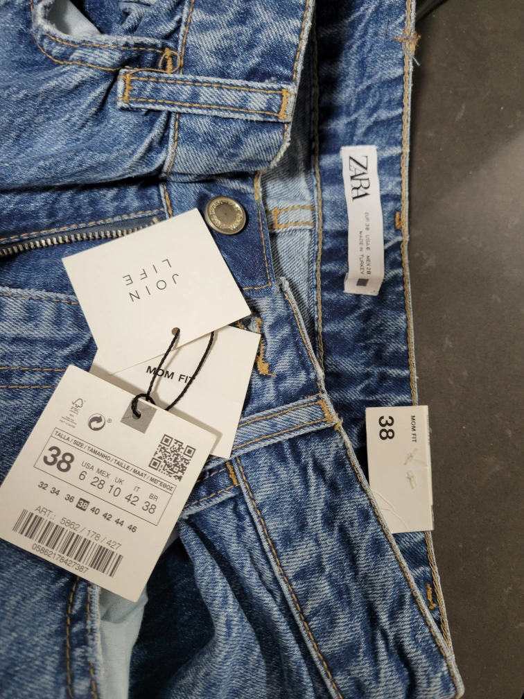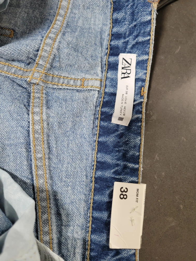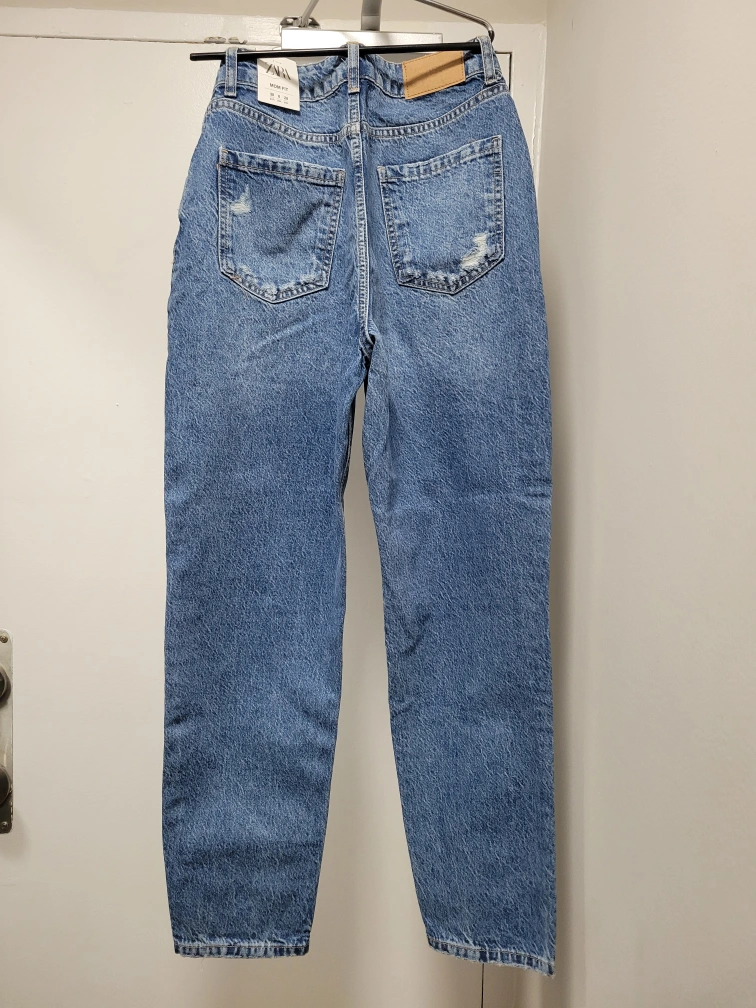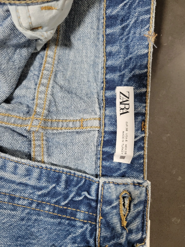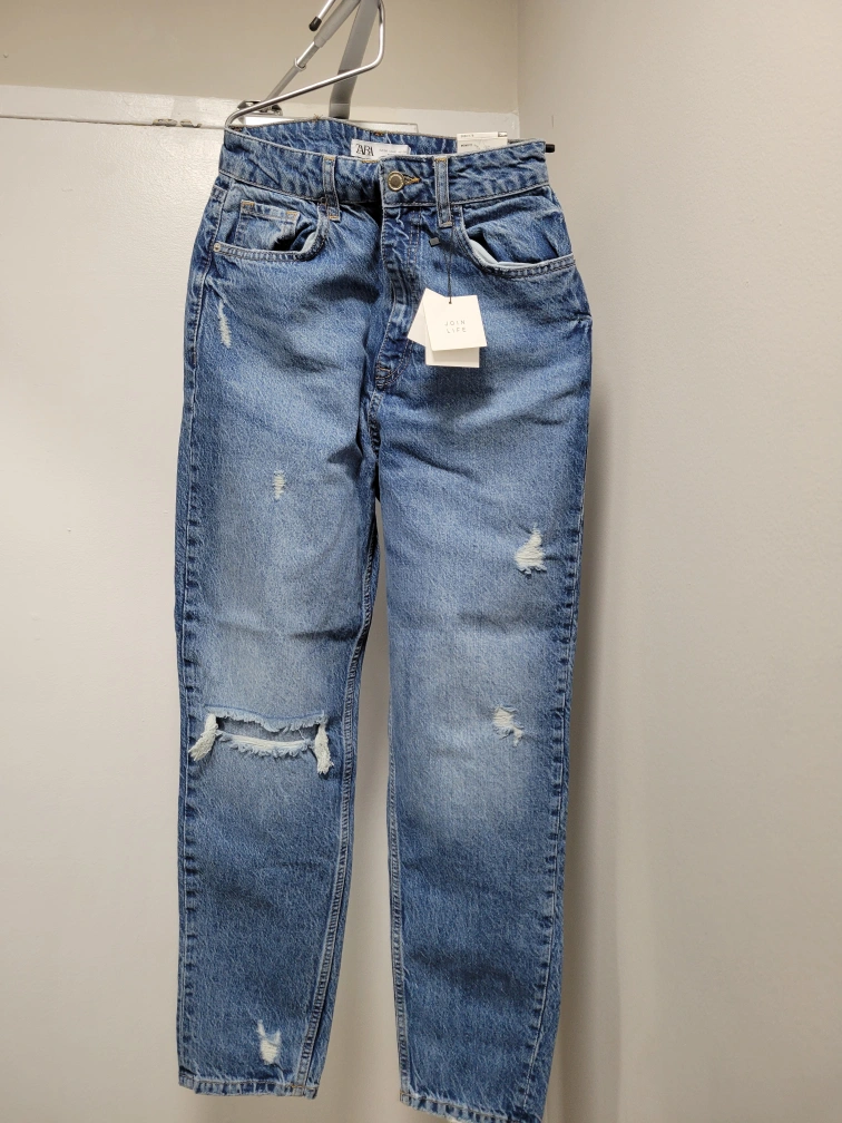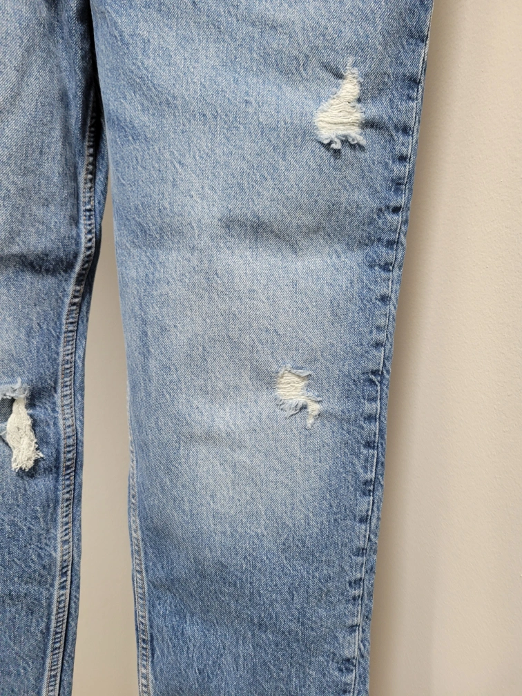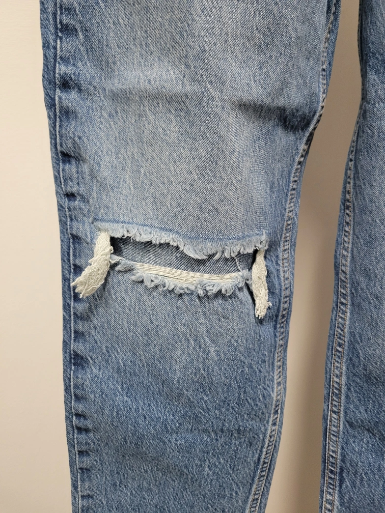 Light blue denim jeans with distressed detailing. Size 38. The fabric doesn't stretch