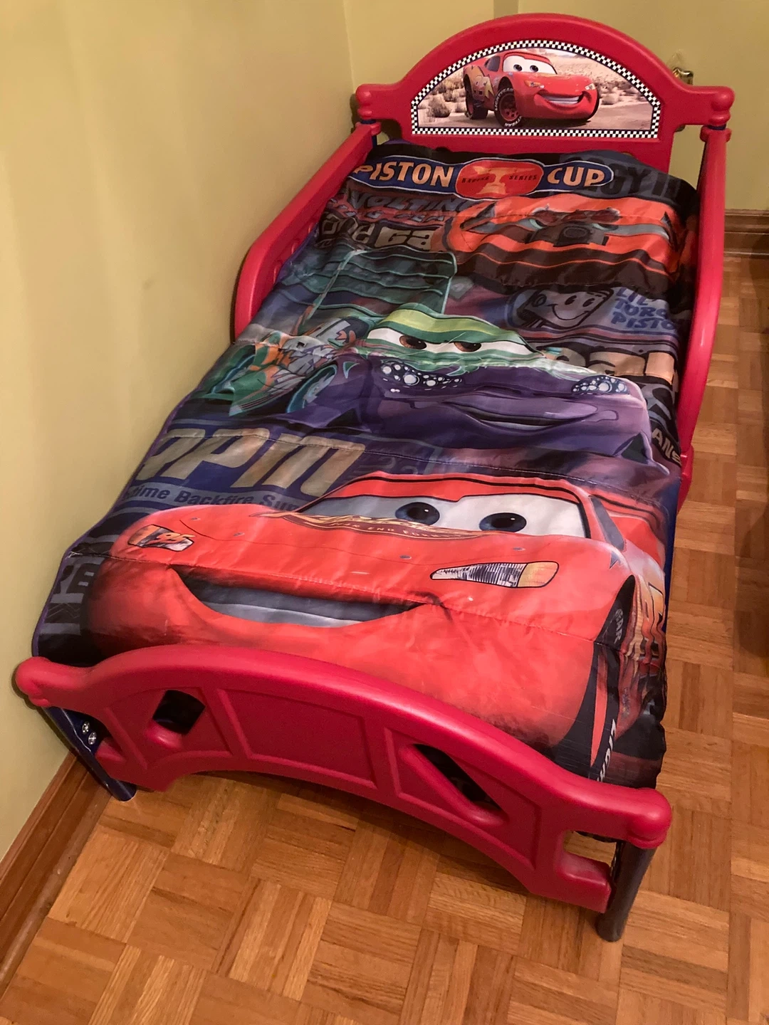 This bright red toddler bed frame features Lightning McQueen and other characters from Disney Pixar's Cars movie. It's a sturdy plastic frame with metal supports, perfect for little racers transitioning to their first "big kid" bed. The side rails help keep your child safe throughout the night!