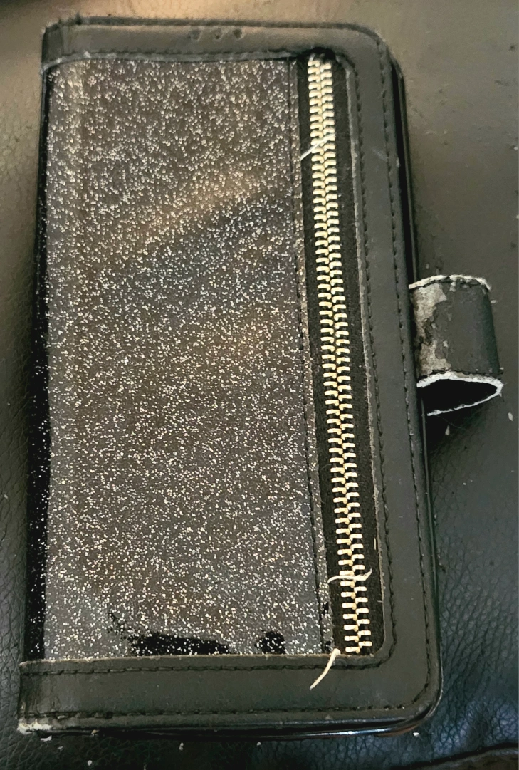This is a used phone case for a Samsung S8 Plus. It is a black wallet style case with a glittery finish and a zipper pocket unfortunatelythe zipper came off. It does show signs of wear, as seen in the pictures, but it is still functional.