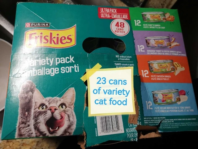 I'm selling 23 cans of Friskies Variety Pack wet cat food, featuring a mix of pate chicken, turkey, and ocean whitefish & tuna flavours. All the cans are sealed with a best before date of October 2026. Pickup Ranchlands NW. Cash accepted.
