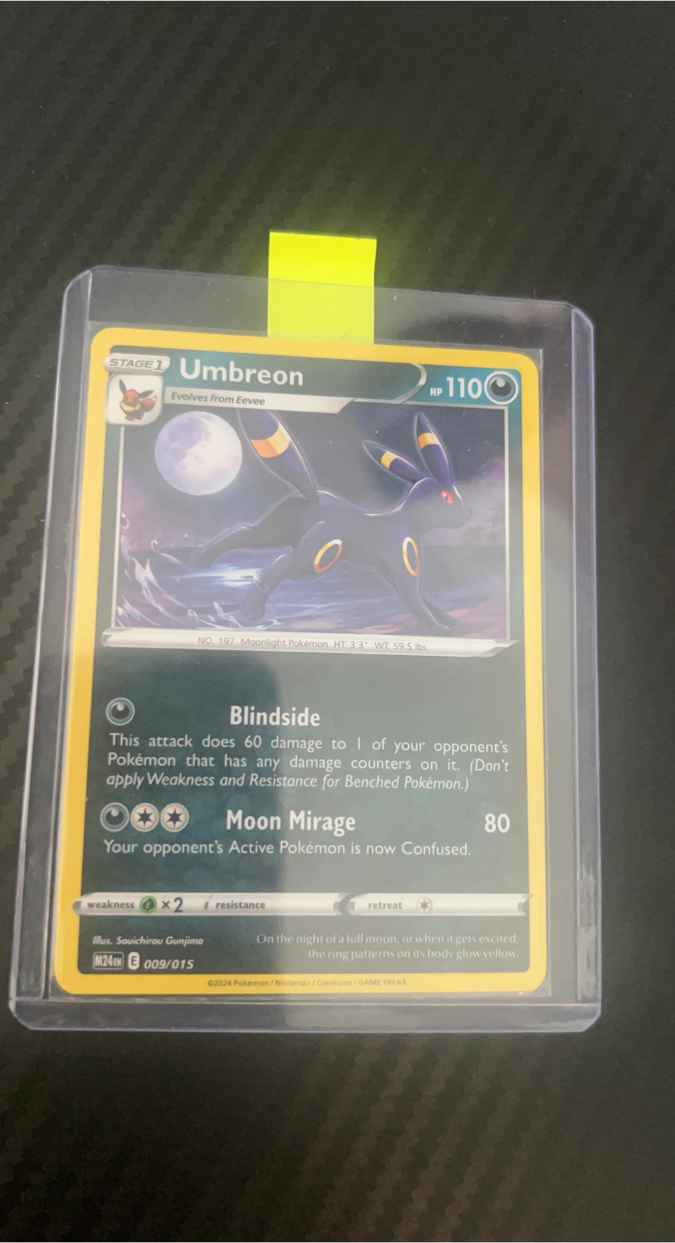 Selling an Umbreon Pokemon card. It evolves from Eevee. The card features the Blindside and Moon Mirage attacks. Illustrated by Souichirou Gunjima, card number M24 EN 009/015. ©2024 Pokémon / Nintendo/Creatures/GAME FREAK