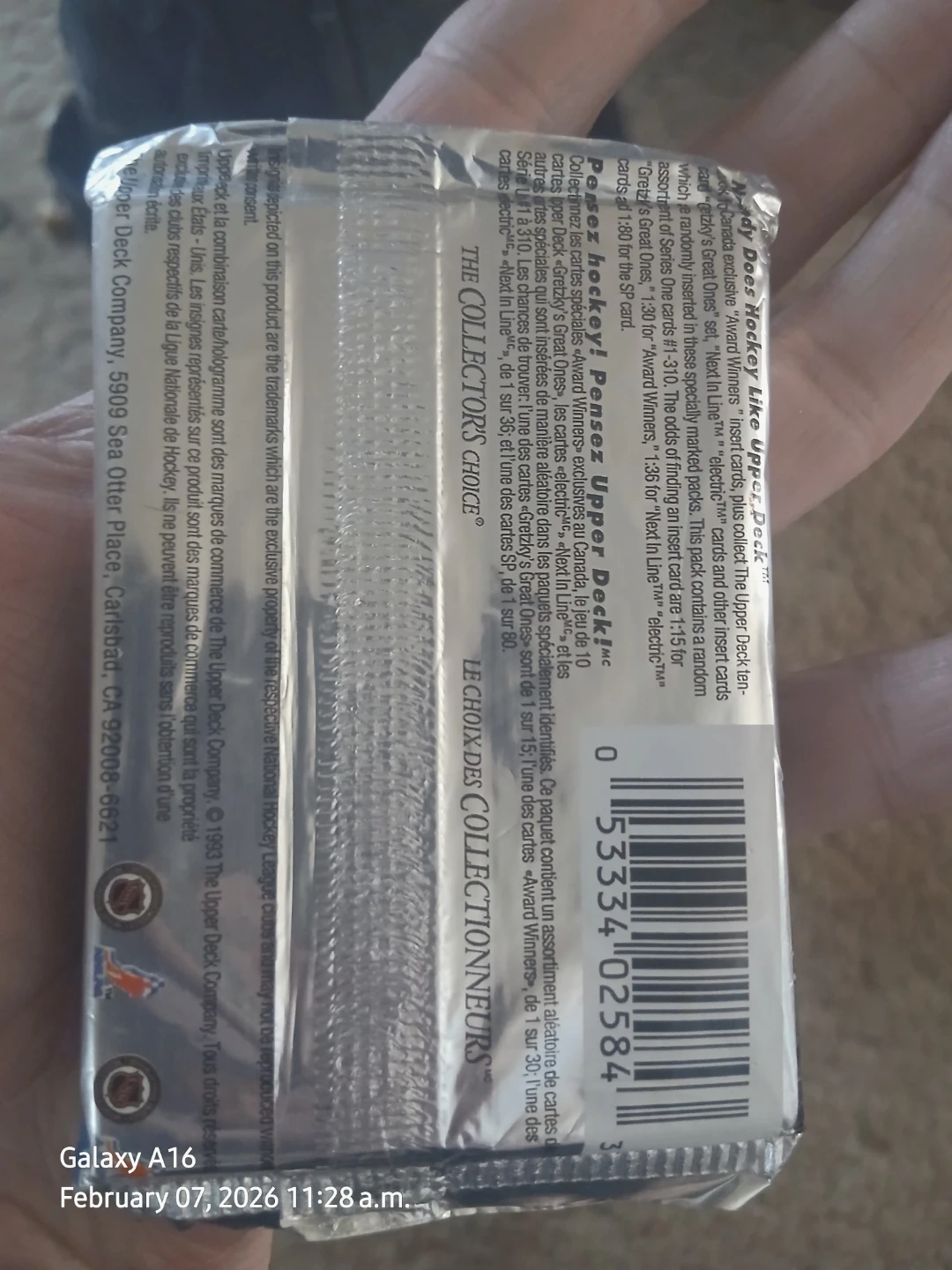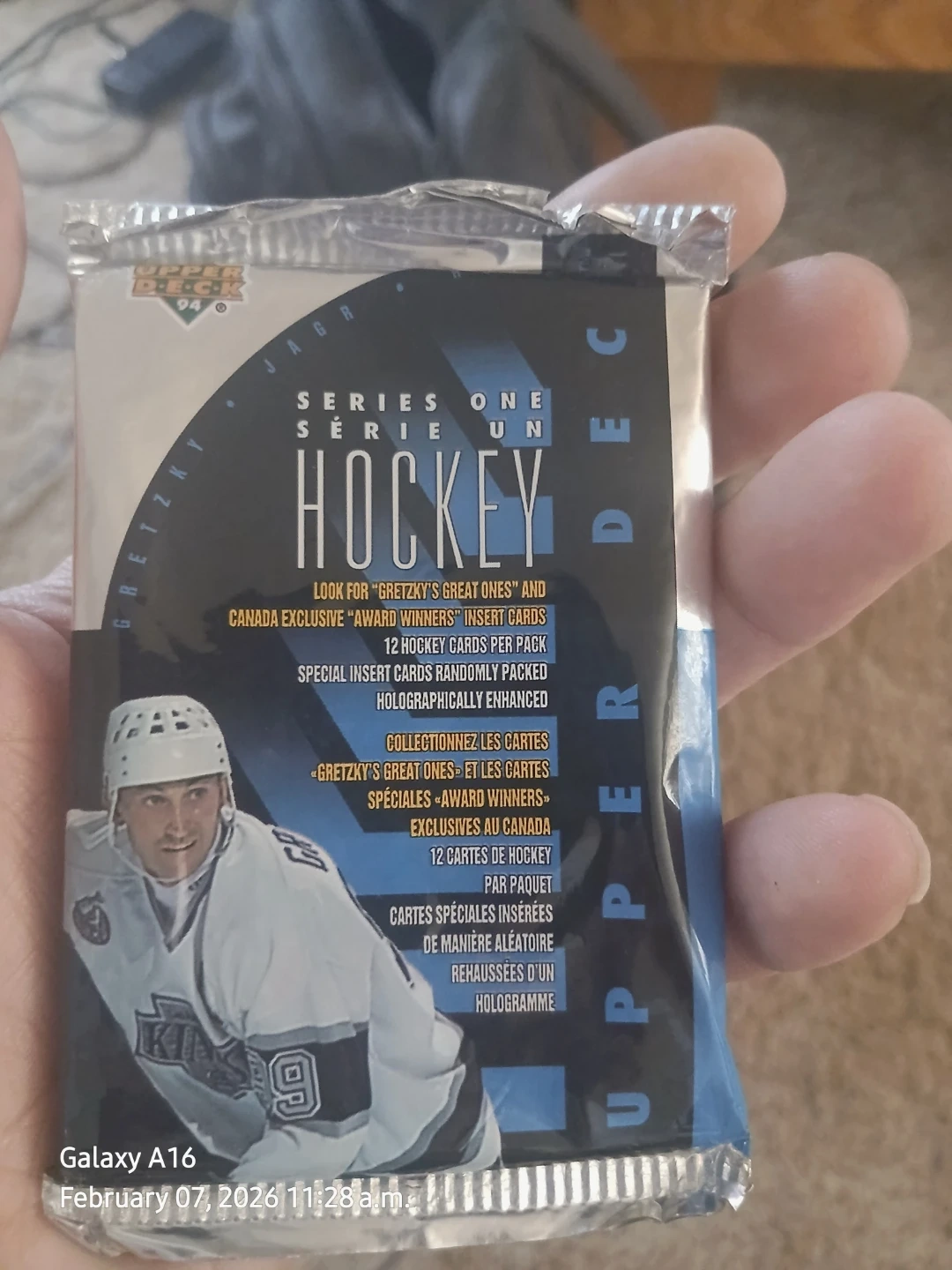 This is a sealed pack of Upper Deck 1991-92 Series One hockey cards. It contains 12 cards per pack, including special insert cards randomly packed. Look for "Gretzky's Great Ones" and Canada exclusive "Award Winners" insert cards. Cards are holographically enhanced.