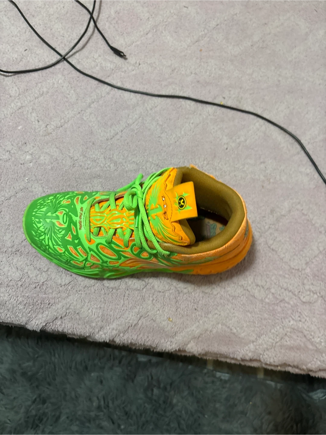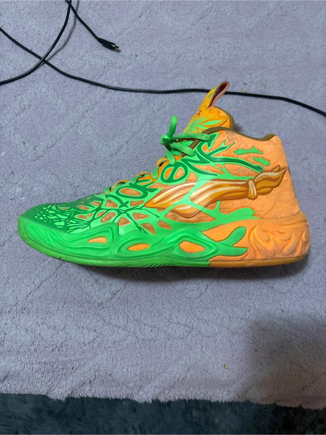 These Lemelo ball puma men's basketball shoes are designed for performance. They feature a vibrant green and blue colourway with an intricate, eye-catching pattern. The shoes offer excellent support and comfort for the court. Perfect for players looking for style and function! But it is kinda slippery but still has traction you just need a little grip spray and it is a little scuffed but it’s not noticeable