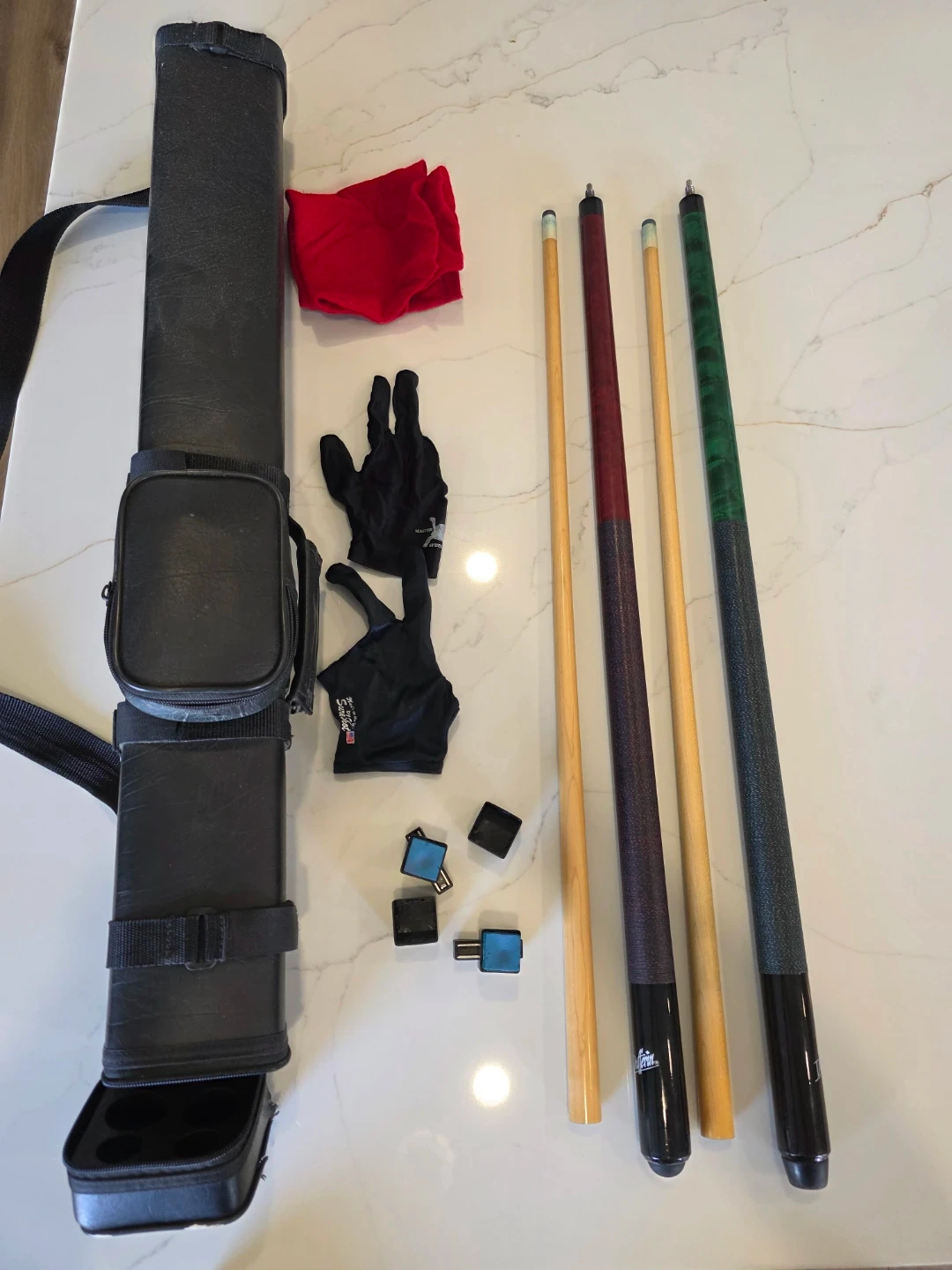 This set includes two pool cue sticks, a black carrying case, and a pair of black billiard gloves. It also comes with chalk holders and a red polishing cloth. The cue sticks have different coloured accents, including burgundy and green.