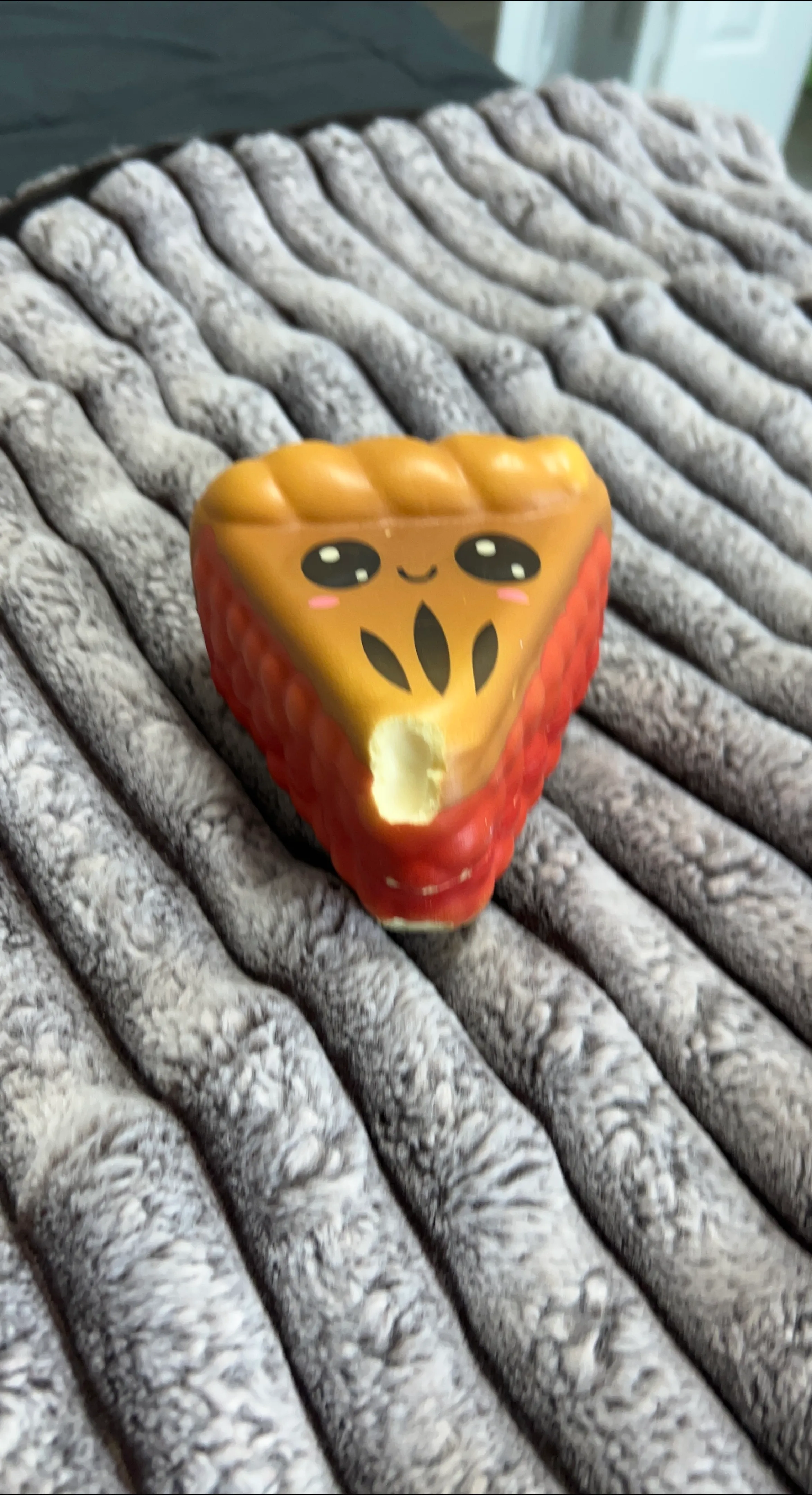 It's a cute and squishy toy shaped like a slice of pumpkin pie. This stress-relief toy is made of soft, squishy material. Great for kids and adults who need a little stress relief!