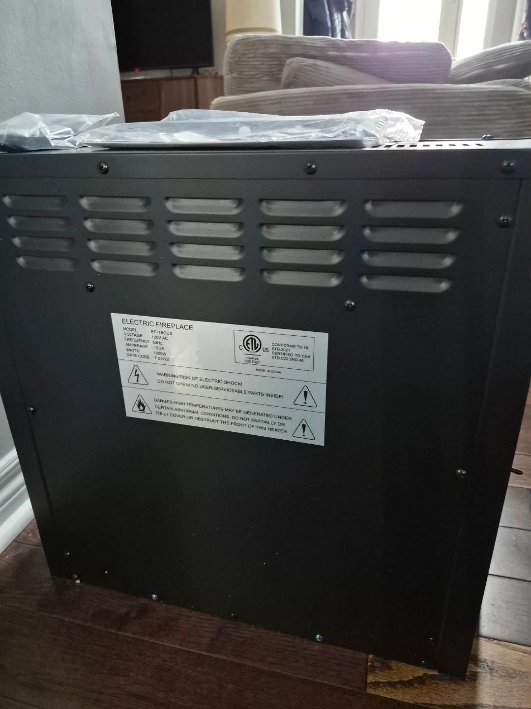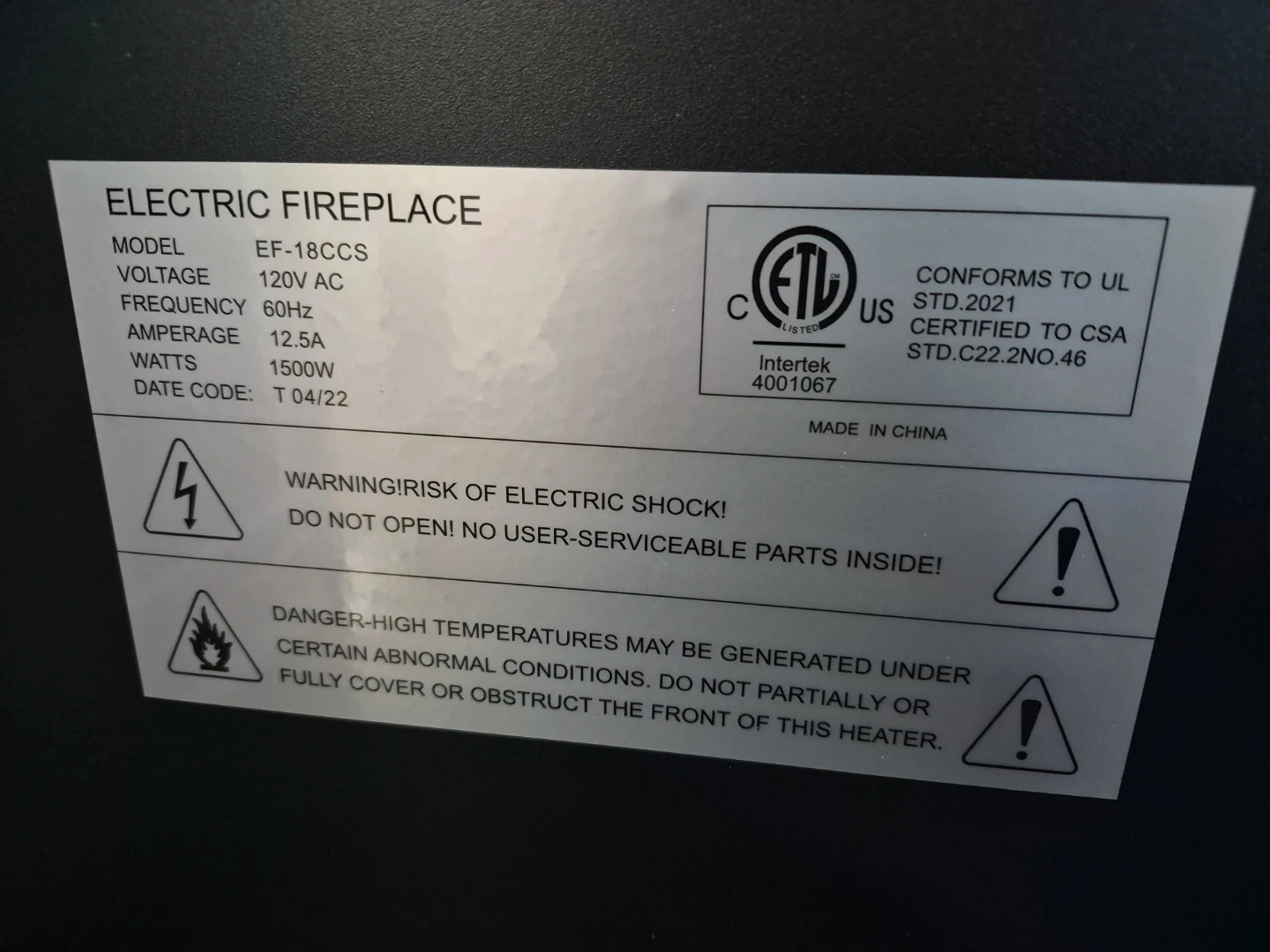 Selling an electric fireplace, model EF-18CCS. It conforms to UL STD.2021 and is certified to CSA STD.C22.2NO.46. It operates at 120V AC and 60Hz, with a wattage of 1500W