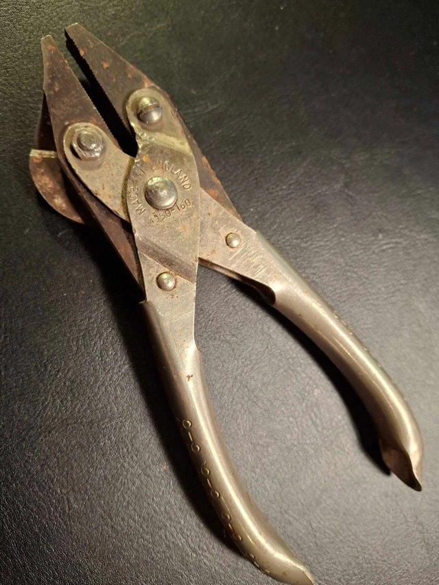 These are Maun Parallel Action Pliers, likely the Flat Nose or Universal model with a side cutter. Their unique parallel action design means the jaws stay parallel throughout their range of motion, providing a secure, vice-like grip. They often feature an open throat for feeding wire through the center. If the ad is up, it's available! Cash accepted.