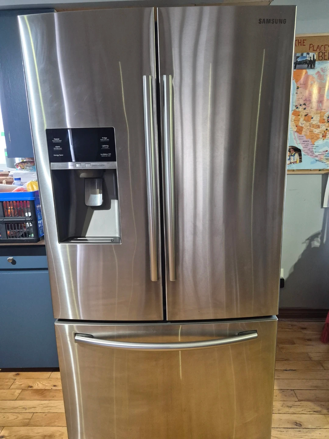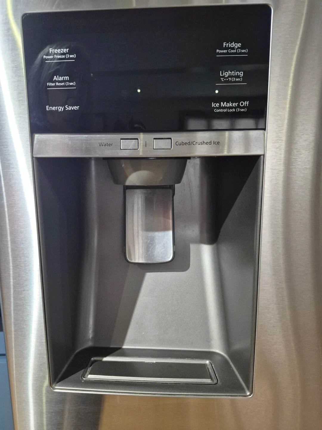 This Samsung French door refrigerator has a capacity of 28 cu ft and a stainless steel finish. It features a bottom freezer drawer and a water and ice dispenser. The unit's dimensions are 35" W x 28 ⅝" D x 70" H (without hinges). It was manufactured in October 2014.