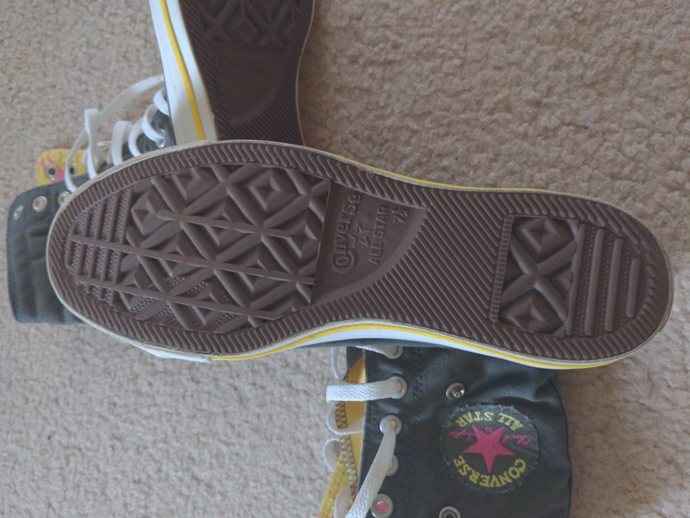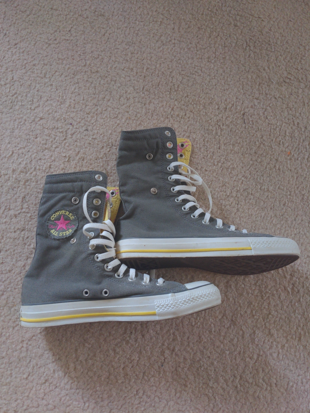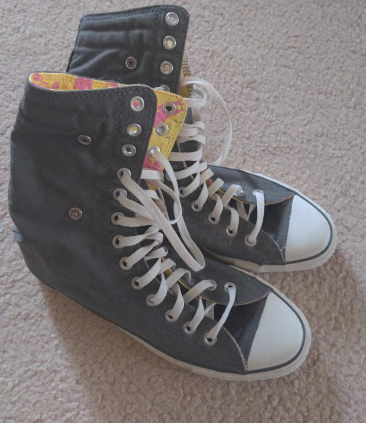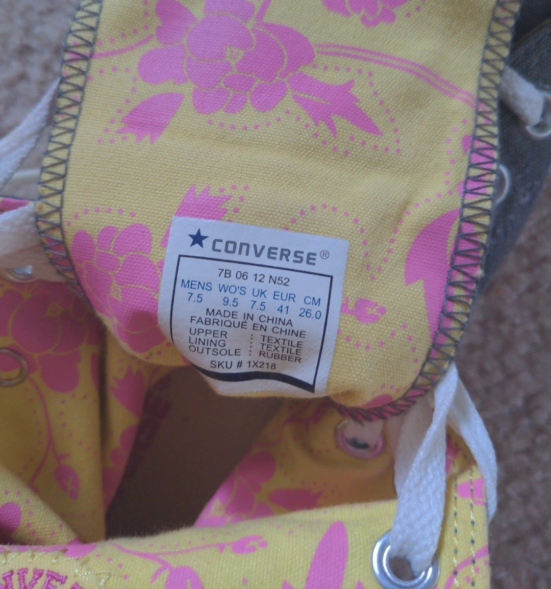 Grey high-top Converse sneakers. Yellow and pink floral interior. Size 9.5 Women's, 7.5 men's.