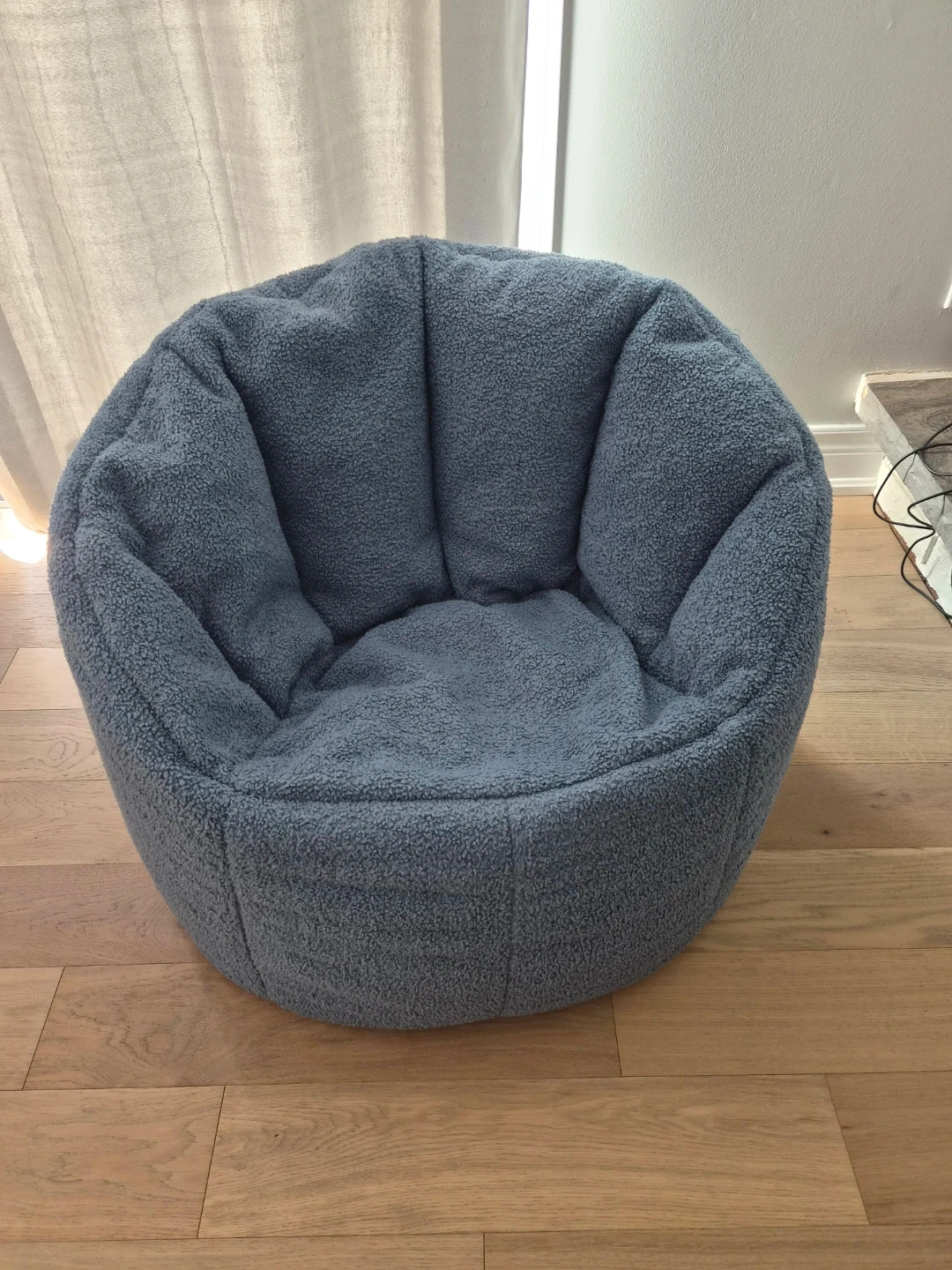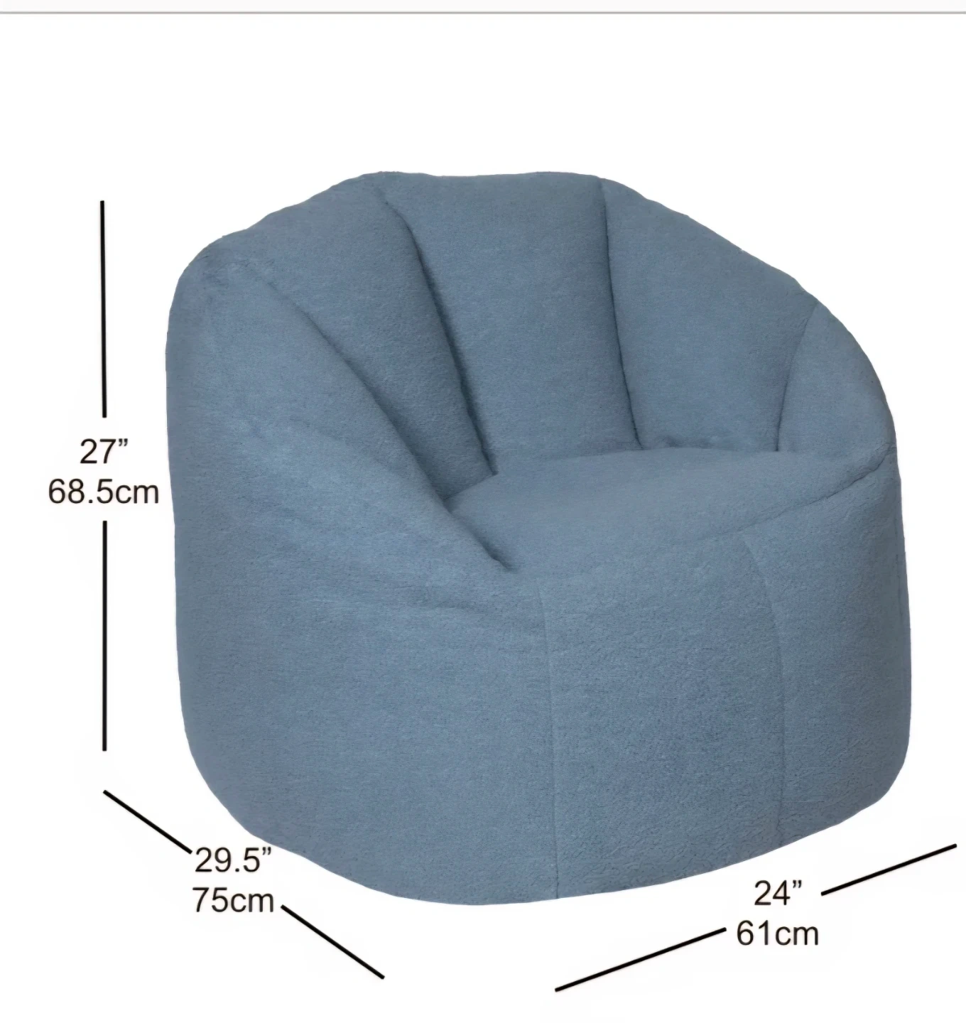 This is a soft, fuzzy bean bag chair in a lovely blue colour. It's designed for comfort and lounging. Measures 27" high, 24" wide, and 29.5" deep. Perfect for a kid's room or den!