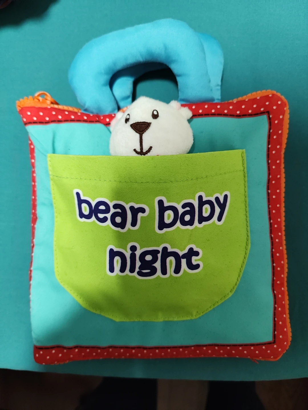 This is a soft fabric book for babies with a bear theme. It features bright colors and different textures to stimulate your baby's senses. Perfect for bedtime stories and quiet time
