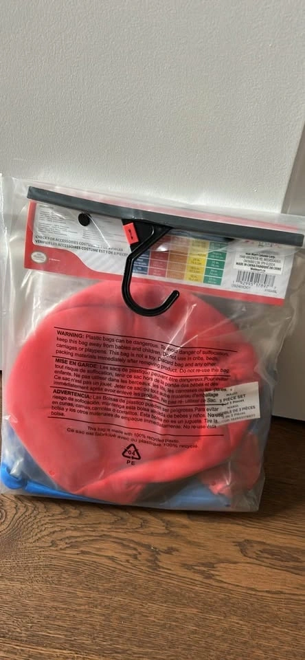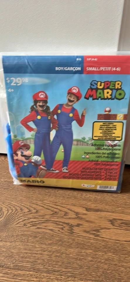 New Super Mario costume for boys. Size Small (4-6). Includes a 3-piece set with jumpsuit, hat, and two self-adhesive mustaches. Still in original packaging.