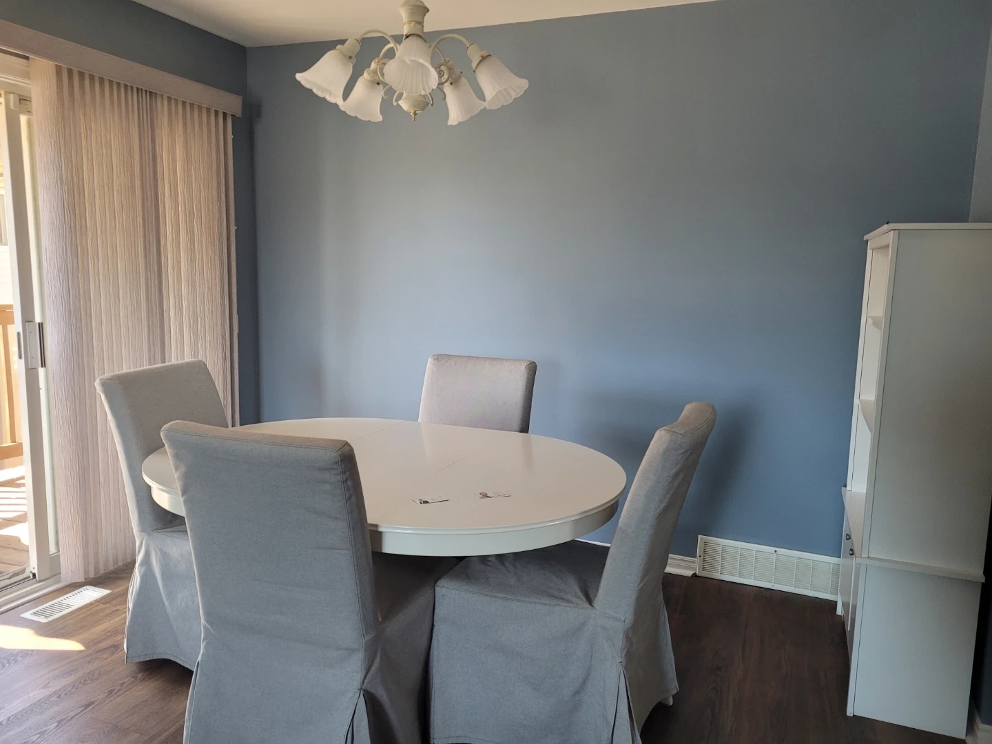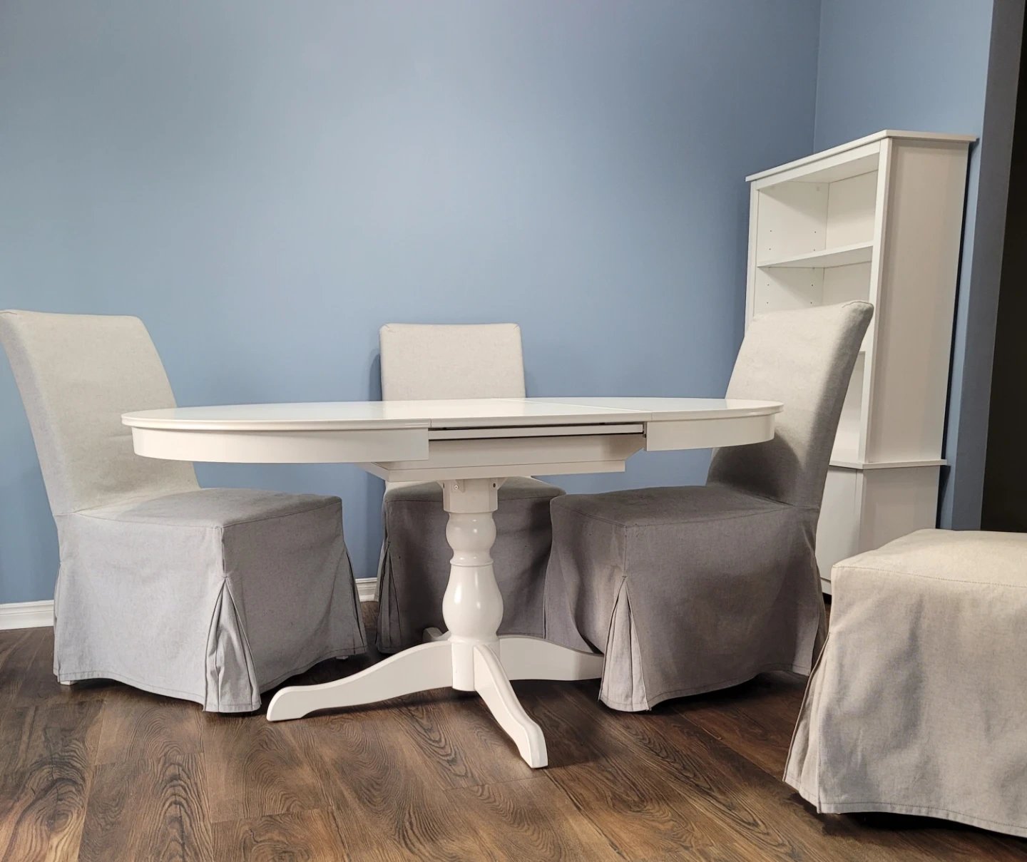 Oval white drop-leaf dining table with four comfortable chairs featuring removable/washable grey canvas slipcovers. Tabletop is smooth and easy to wipe down. Table top is shown extended but can be adjusted smaller.