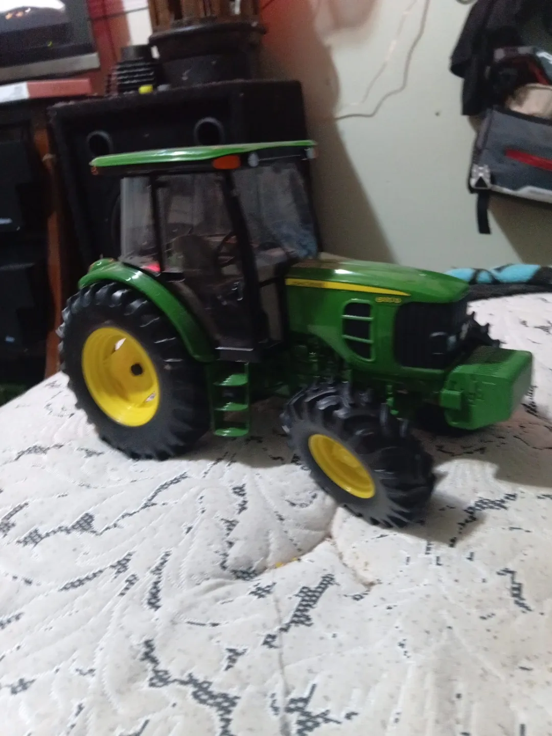 Green and yellow John Deere 7530 toy tractor model. Detailed design with realistic tires and cab. Great for collectors or farm toy enthusiasts!