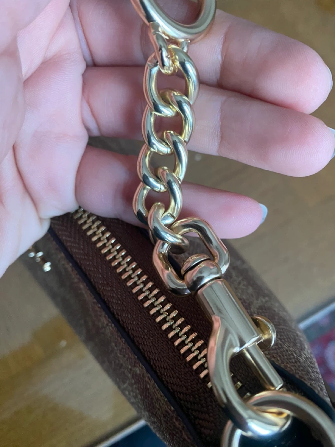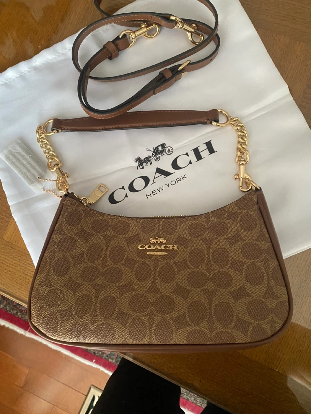 This is a Coach small shoulder bag in their signature "C" monogram print. It features gold-tone hardware and a detachable strap. It comes with a dust bag.and 2 straps. UA