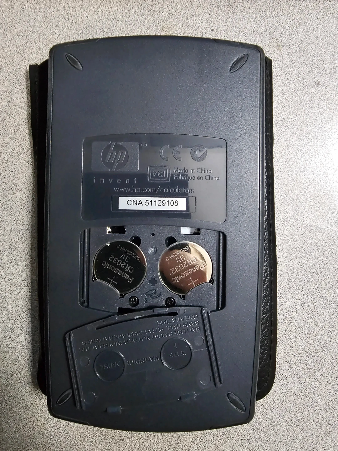 This is an HP 10bII business calculator. It comes with a protective black leather case. The calculator uses two CR2032 batteries.