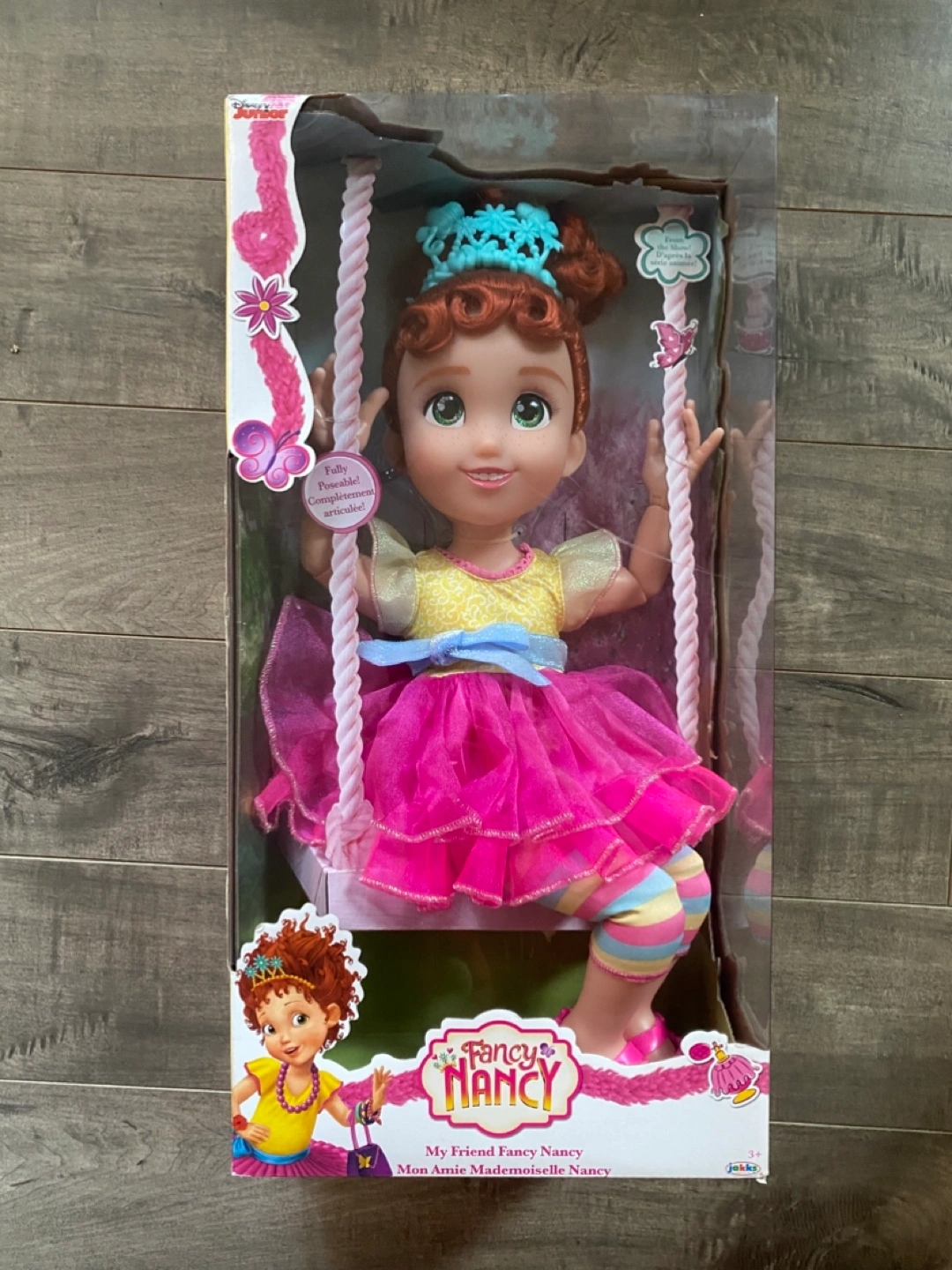 Rate find. This Fancy Nancy doll is ready for imaginative play. She's dressed in a fancy outfit with colourful striped leggings and shoes. This doll is fully poseable for lots of fun! It's great for kids who love dress-up and pretend play.