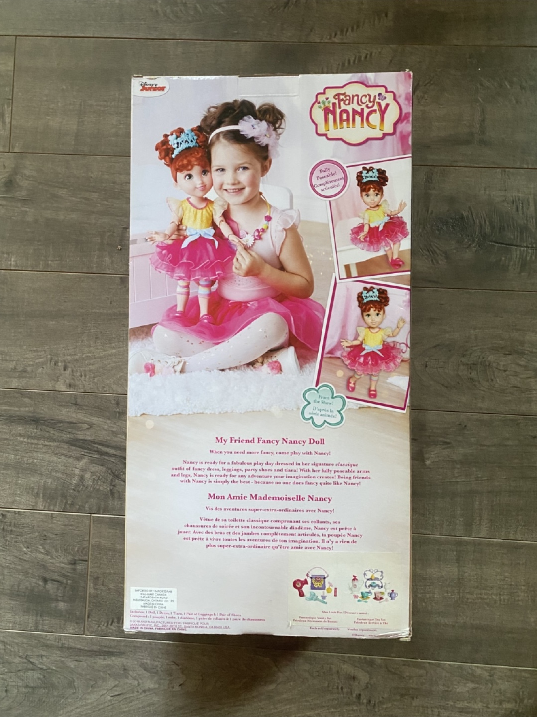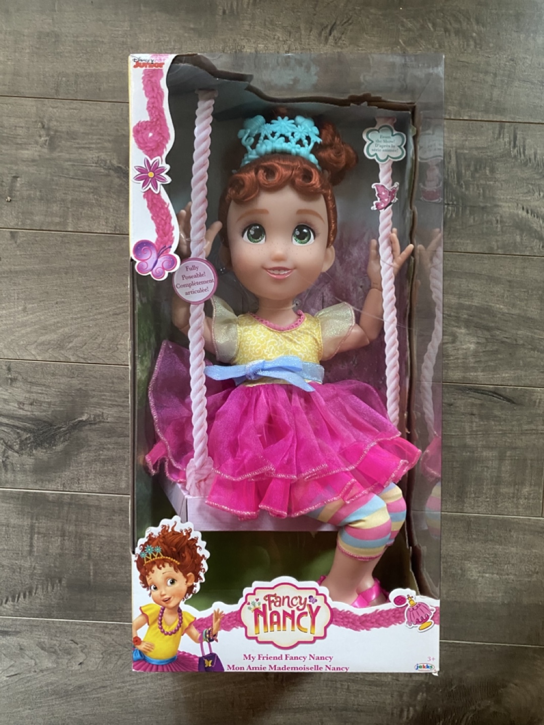 Rate find. This Fancy Nancy doll is ready for imaginative play. She's dressed in a fancy outfit with colourful striped leggings and shoes. This doll is fully poseable for lots of fun! It's great for kids who love dress-up and pretend play.