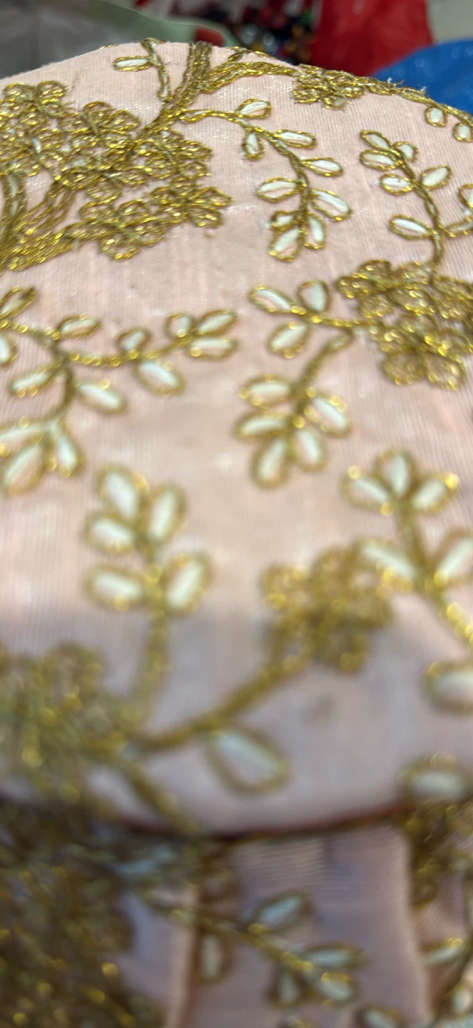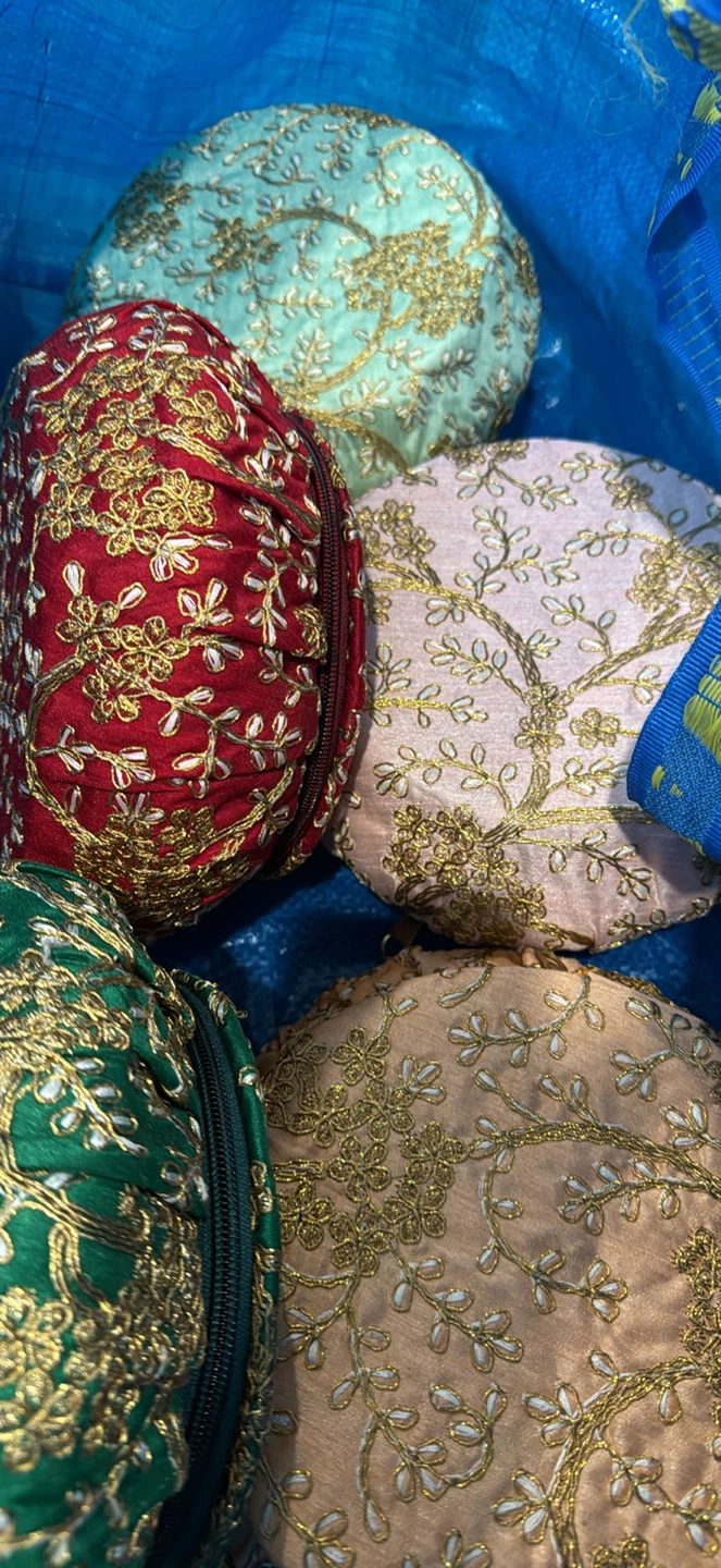 Five beautifully embroidered round evening purses. They're adorned with intricate gold thread floral designs. Colours include red, pink, green, tan, and light blue.