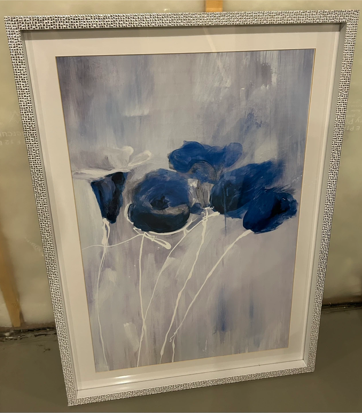 A lovely floral painting featuring blue and white flowers. It's framed and ready to hang, perfect for adding a touch of colour to any room.