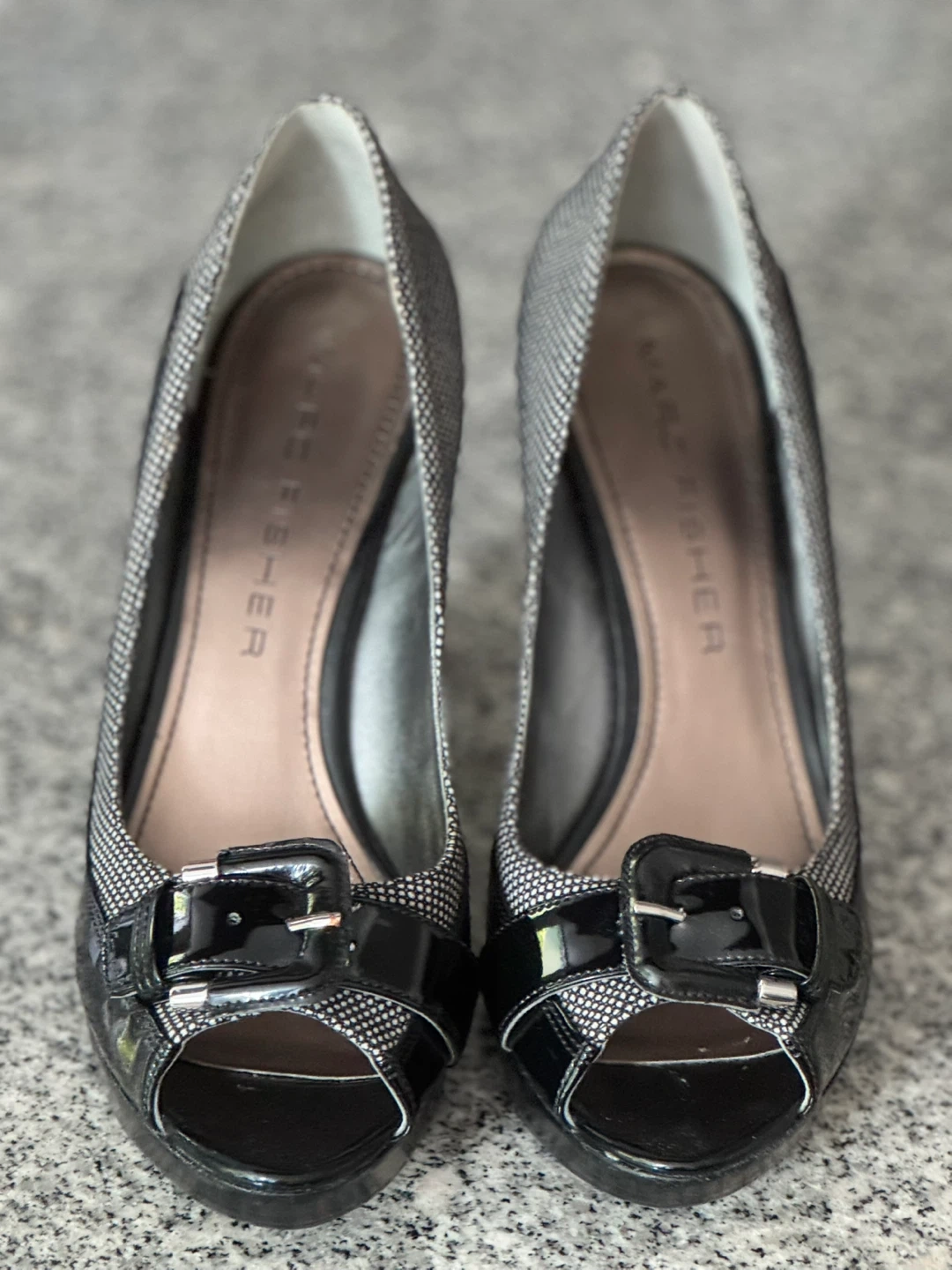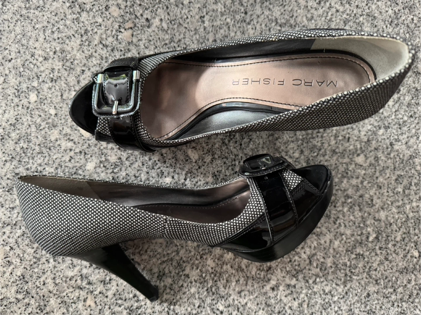 Cute Marc Fisher stilettos patent leather heels in black and gray. They have a peep toe and a buckle detail. Perfect for dressing up an outfit. It’s in excellent condition.