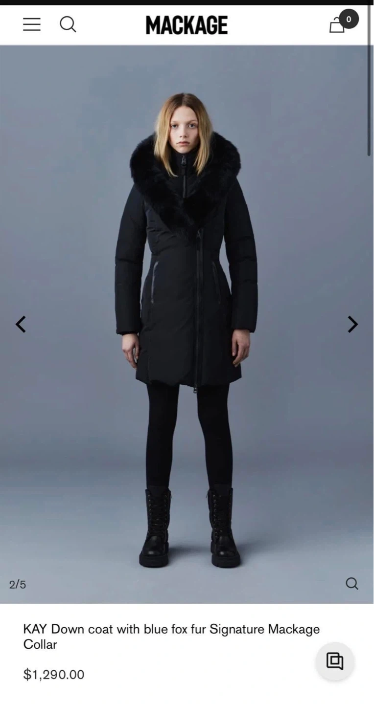MACKAGE KAY down coat featuring a blue fox fur collar and signature detailing. It's black and includes a removable belt. This coat is perfect for keeping warm in cold weather.