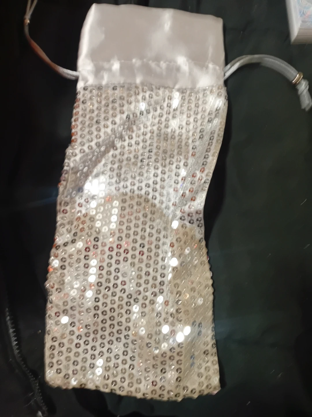 A sparkly pouch bag covered in silver sequins. It has a satin drawstring closure at the top. This pouch would be handy for storing small items or for use as a gift bag!