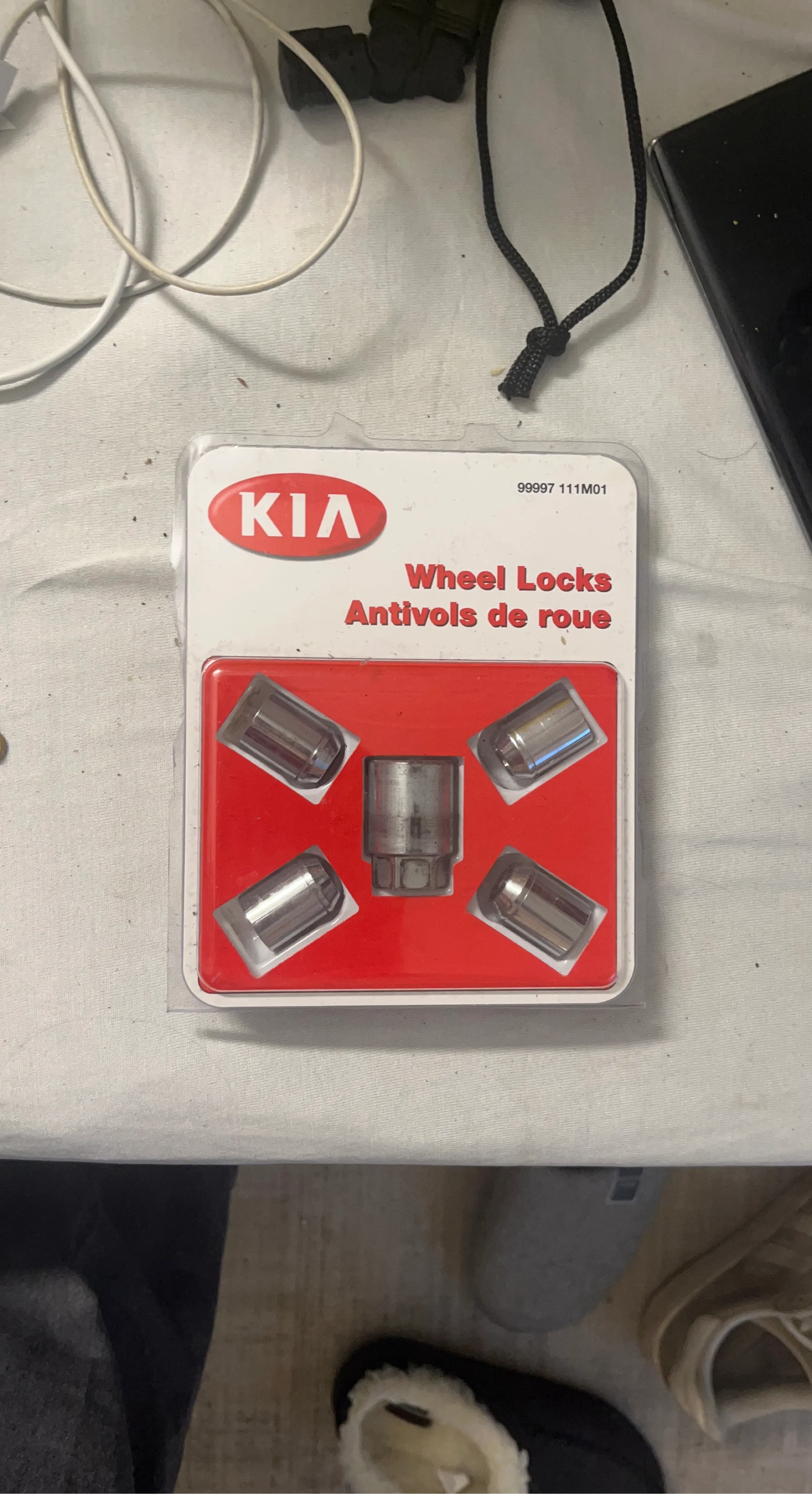Set of 4 KIA wheel locks with a key. These are designed to help secure your vehicle's wheels. They're made of metal and come in the original packaging.