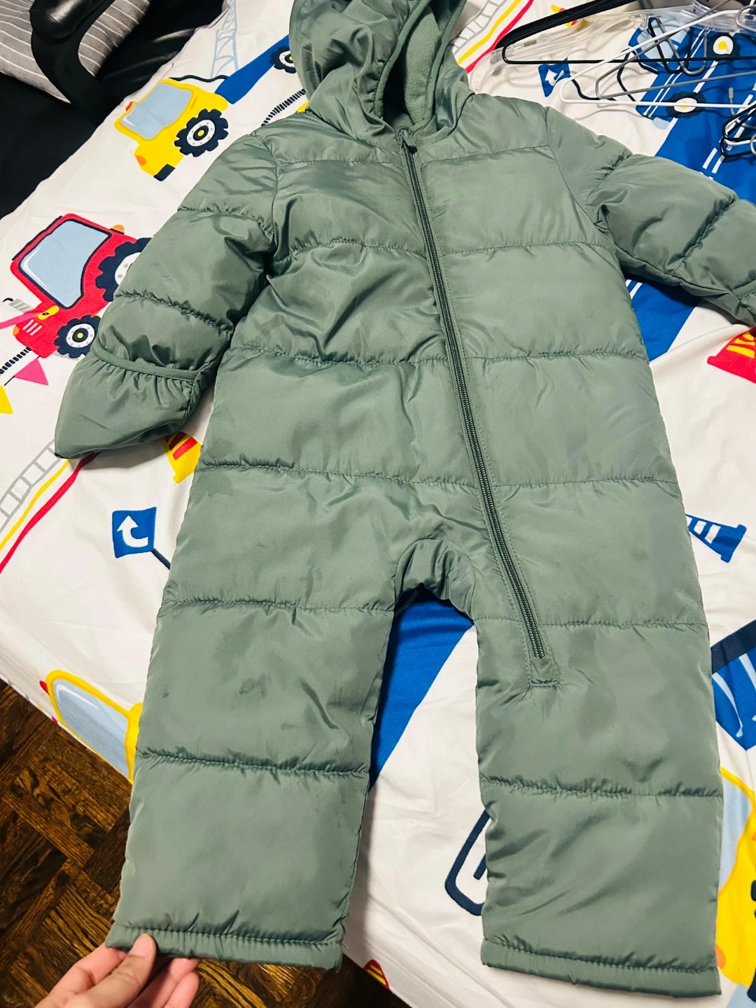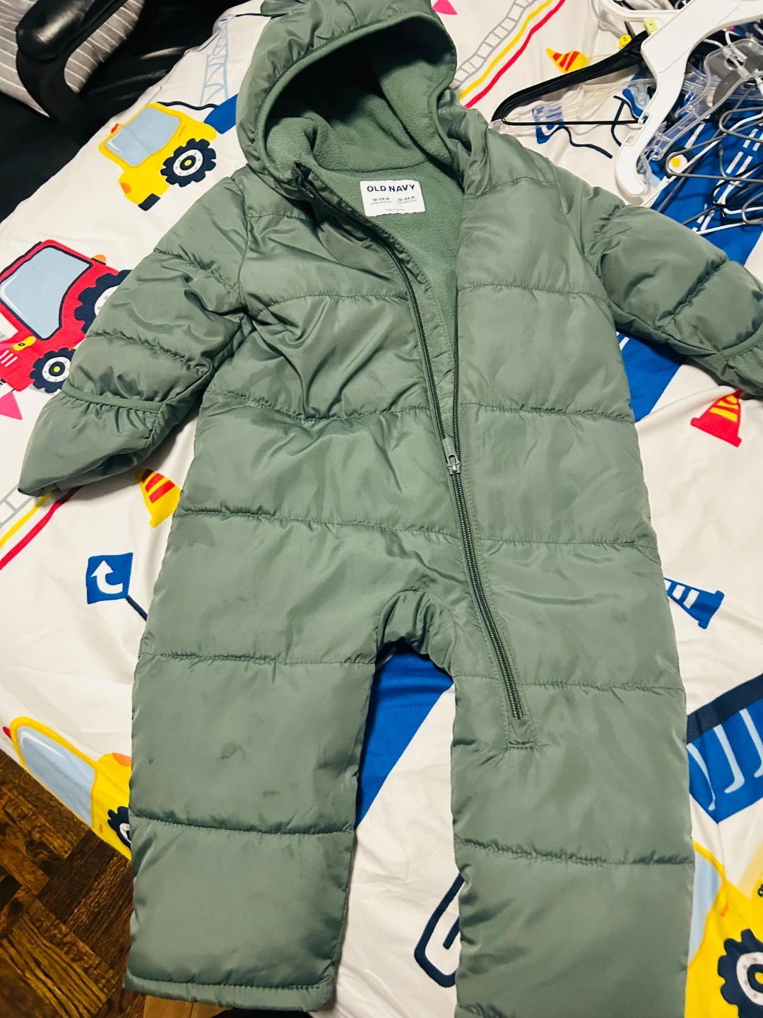 This Old Navy puffer snowsuit is a warm, green one-piece outfit. It's made for cold weather and has a full zipper closure. Great for keeping little ones toasty on chilly days!
