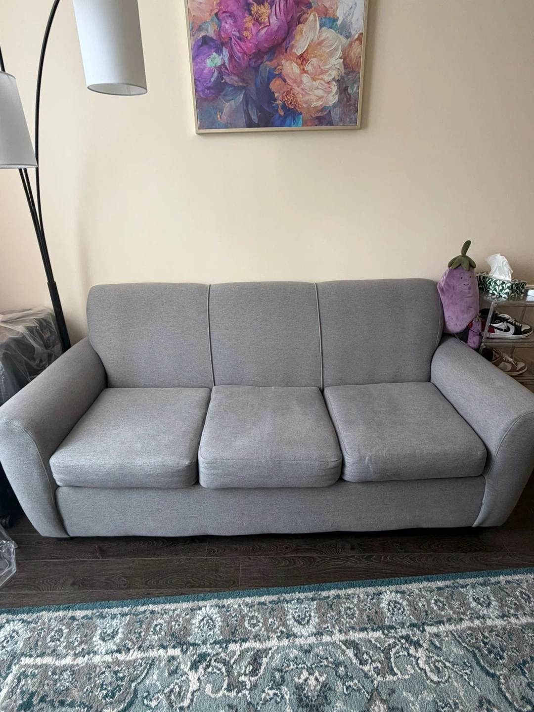 Selling a well-maintained grey fabric sofa. Clean, comfortable, and perfect for any modern living space. From a no smoking, no pet home.