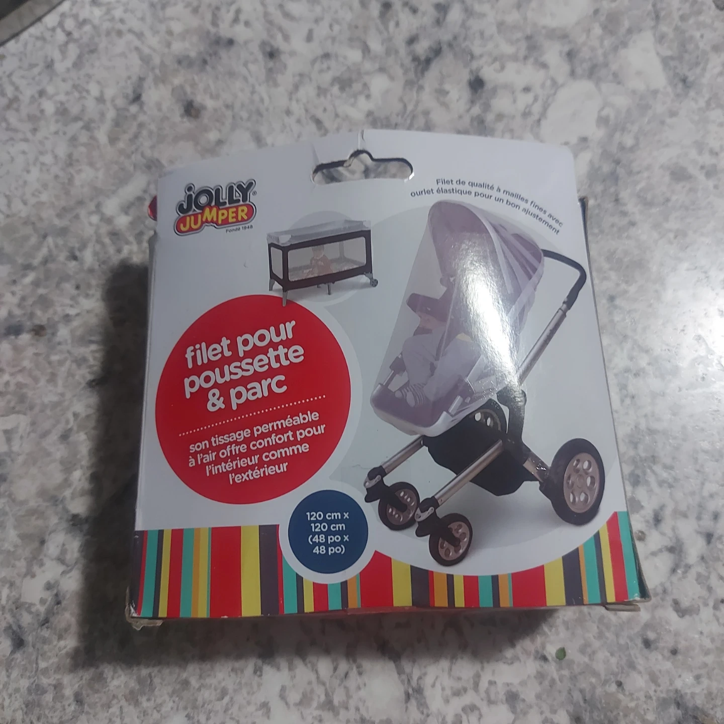 This is a Jolly Jumper stroller and playpen net. It's a permeable mesh for air comfort. Dimensions are 120 cm x 120 cm (48 in x 48 in).