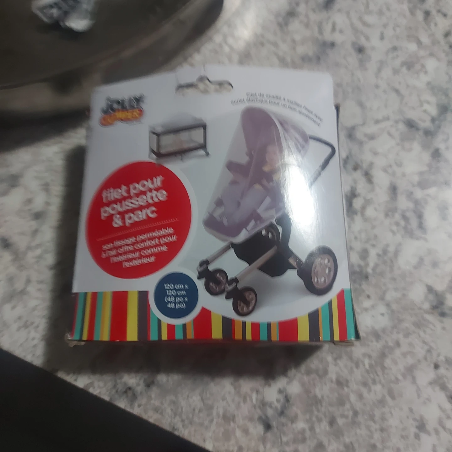 This is a Jolly Jumper stroller and playpen net. It's a permeable mesh for air comfort. Dimensions are 120 cm x 120 cm (48 in x 48 in).