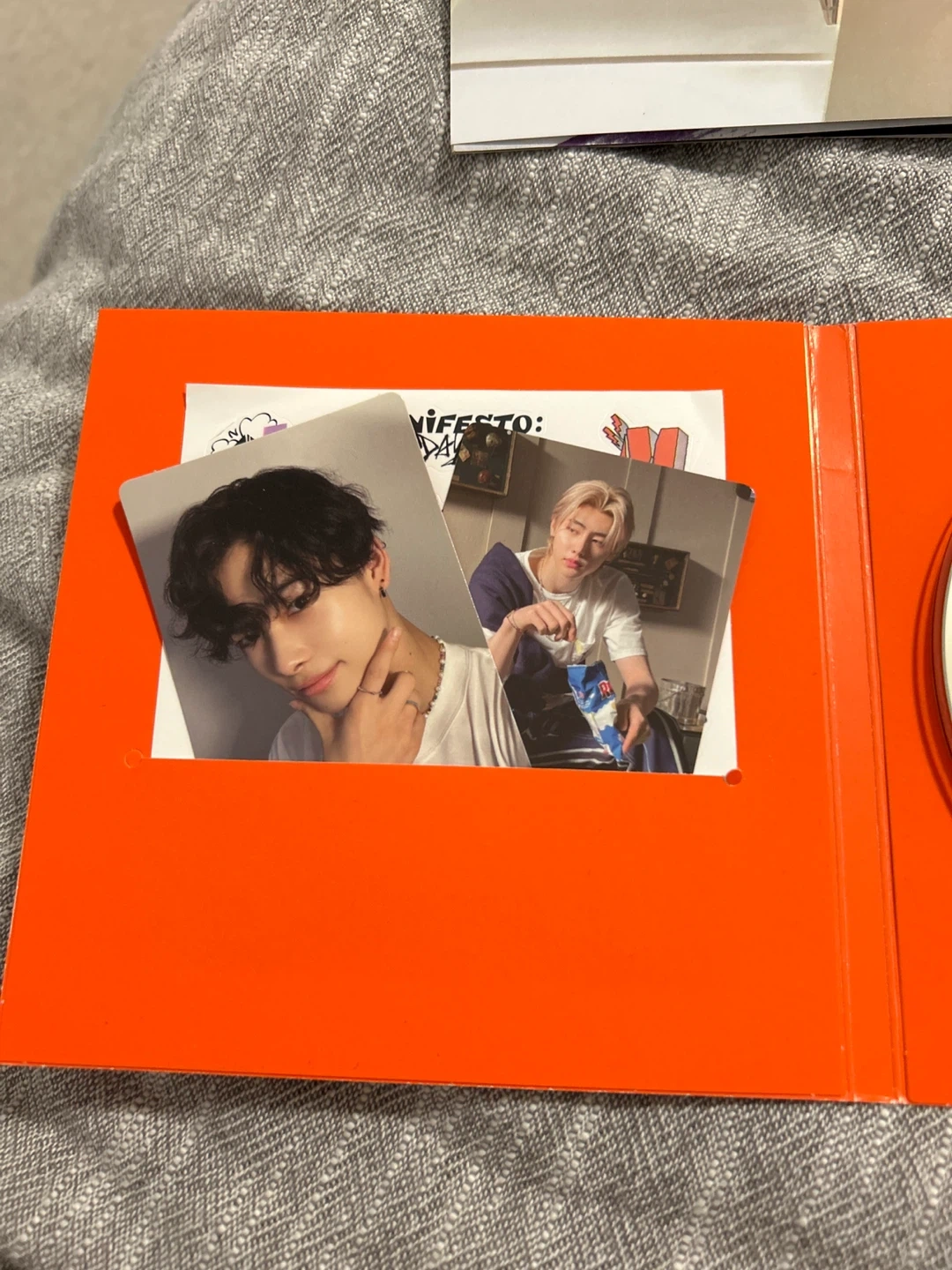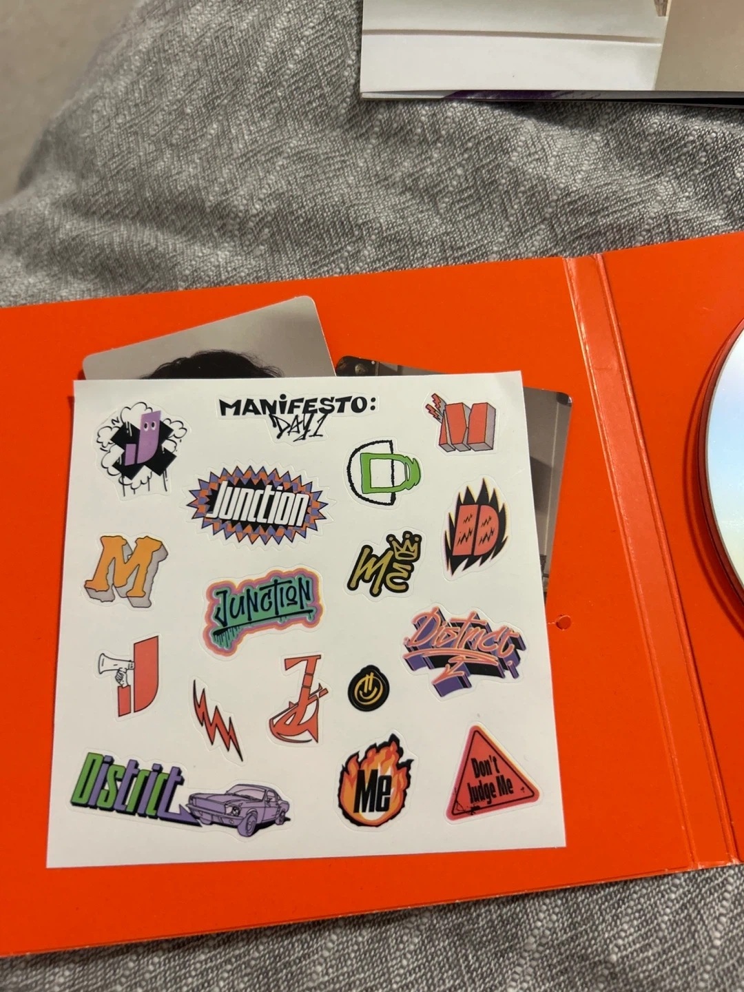 This is the ENHYPEN MANIFESTO : DAY 1 album CD. It includes a CD, photobook, stickers, and photocards. Nothing is used, there is light scuffing on the cover of the container at the back, and a little (normal and came like this) creasing on the poster where it was folded how it came.