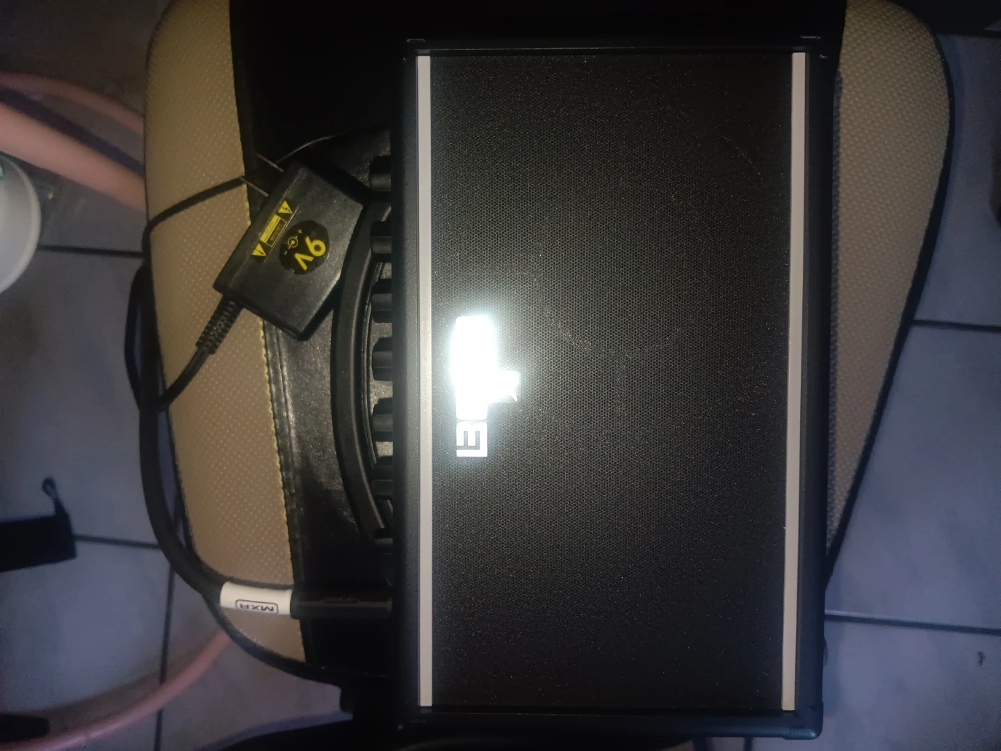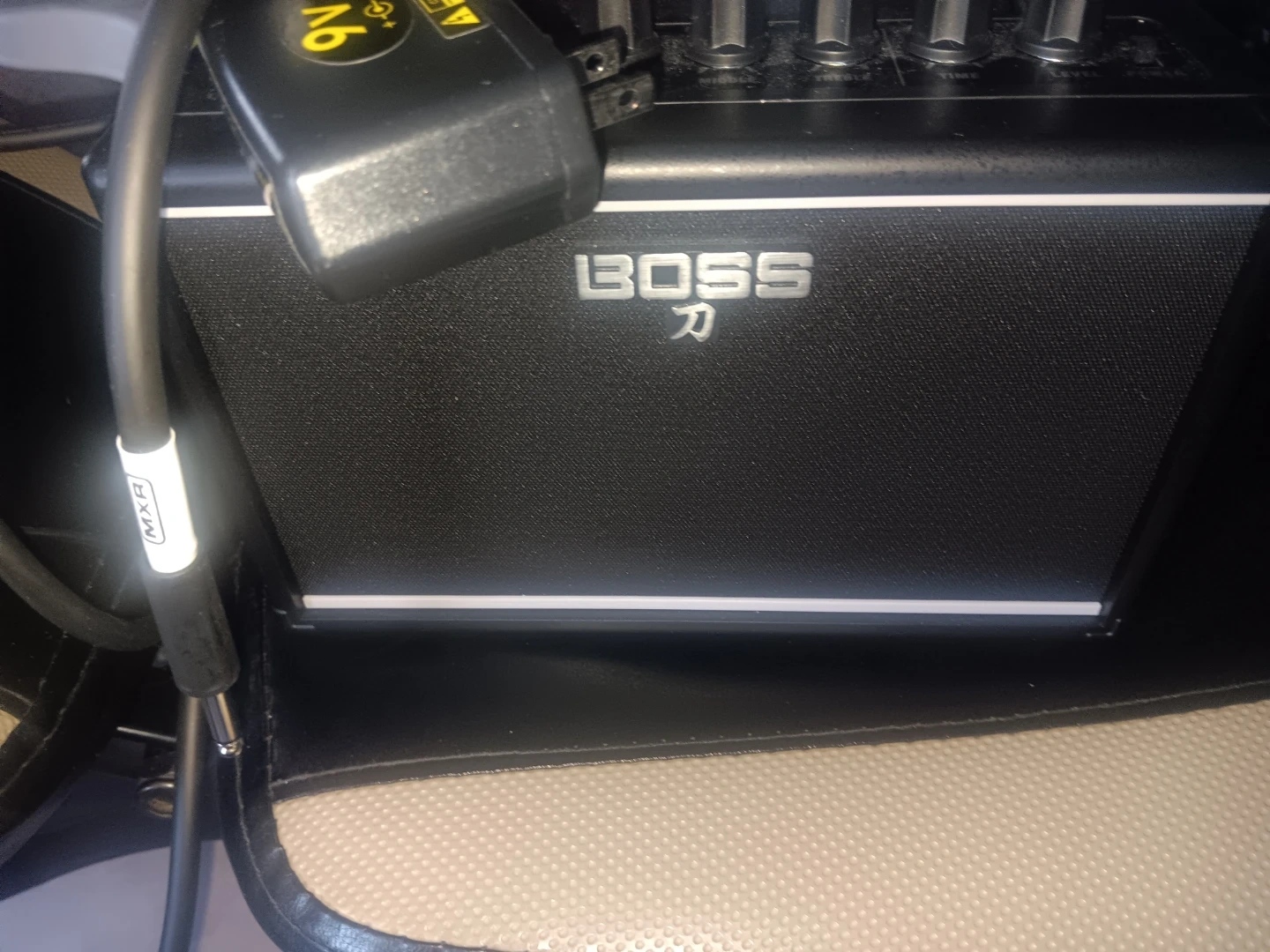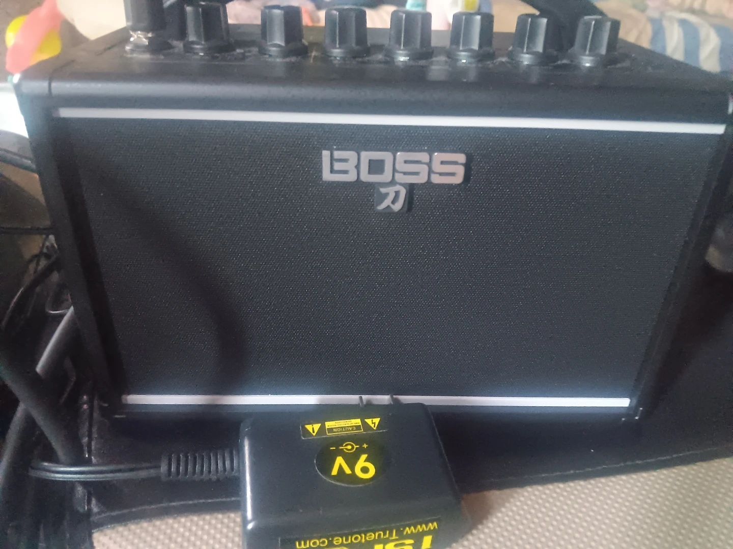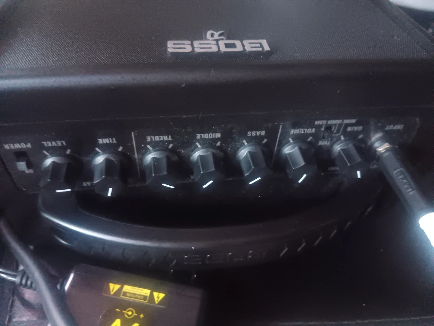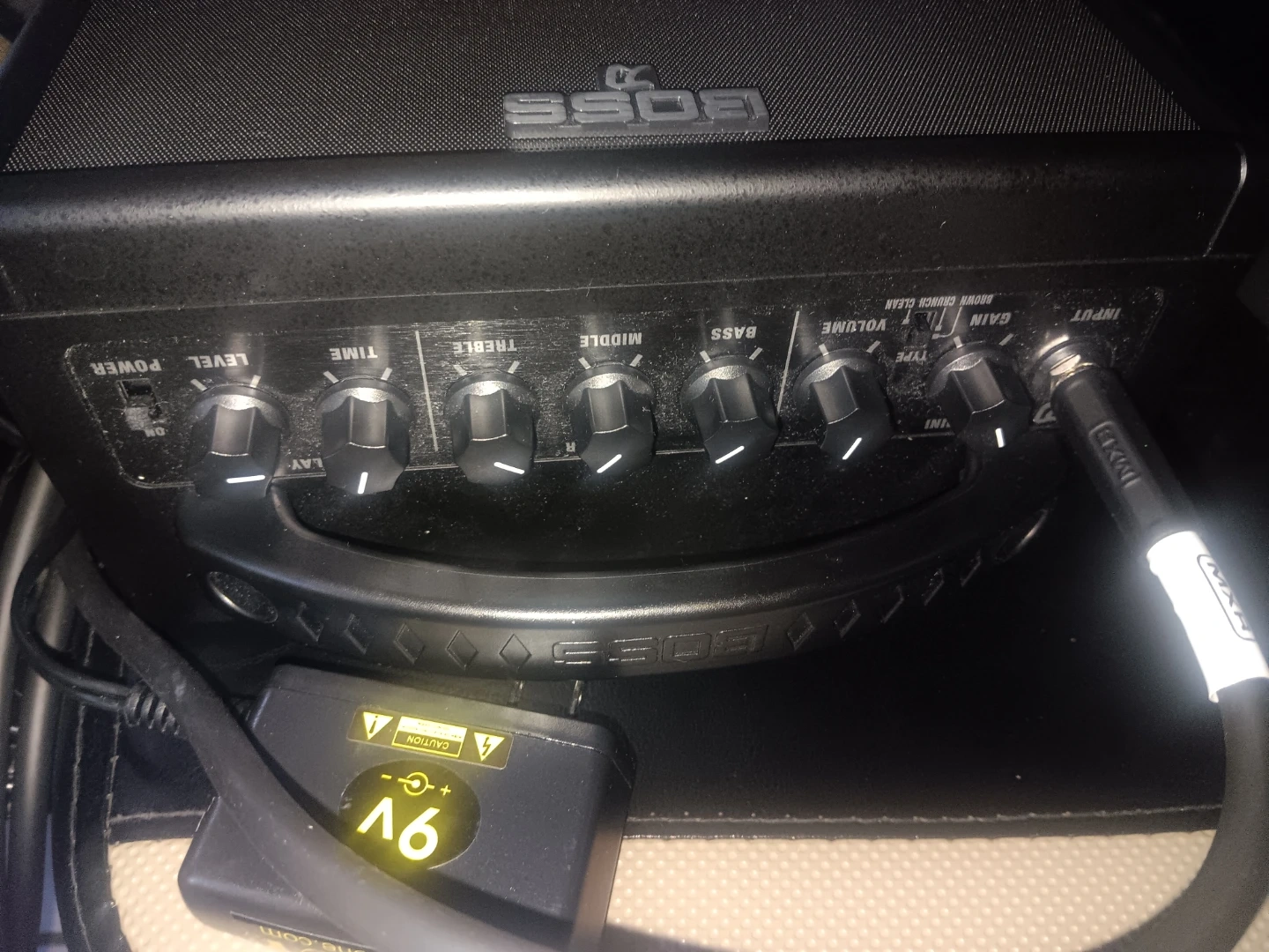 This is a compact BOSS Katana Mini guitar amplifier. It has controls for Level, Time, Treble, Middle, Bass, Volume, and Gain. It's powered by a 9V adapter and includes an input jack.