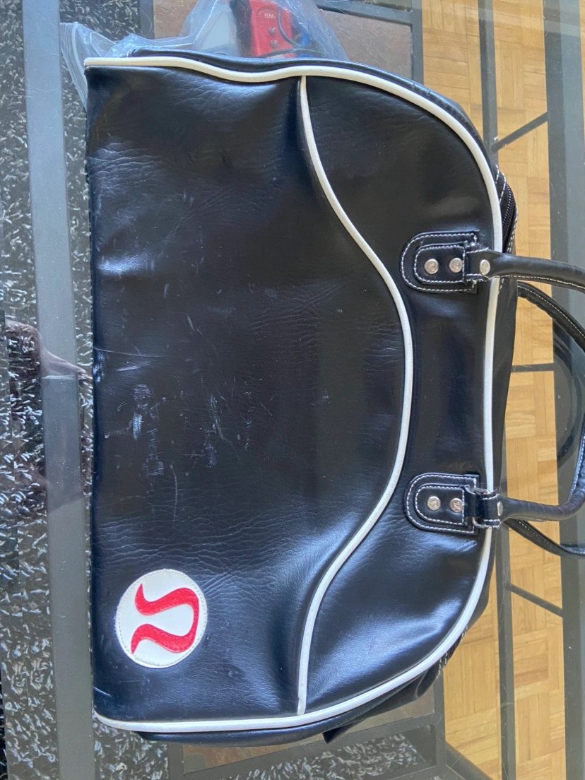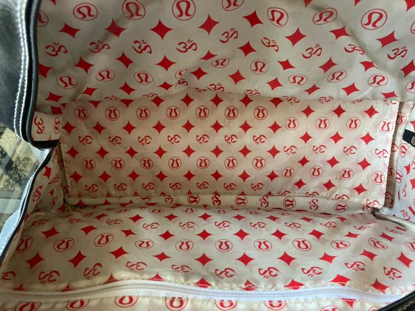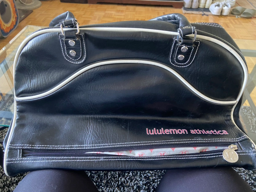 vintage lululemon gym bag. There is the top opening as well as a small pocket at the bottom of the bag aswell. Is has a few scuffs on the side with the logo