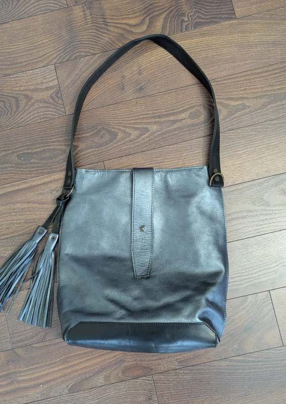 Gorgeous metallic grey leather shoulder bag. Features a shoulder strap, tassels, and a unique design. Black leather accents. Designer from Puerto Vallarta. Great bag.