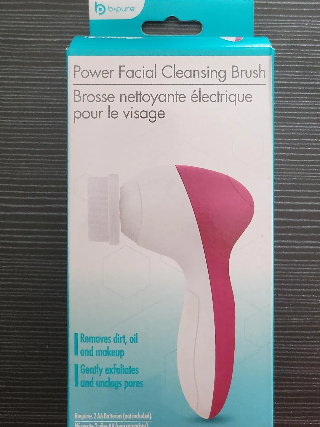 This b.pure power facial cleansing brush removes dirt, oil, and makeup. It gently exfoliates and unclogs pores. Requires 2 AA batteries (not included).