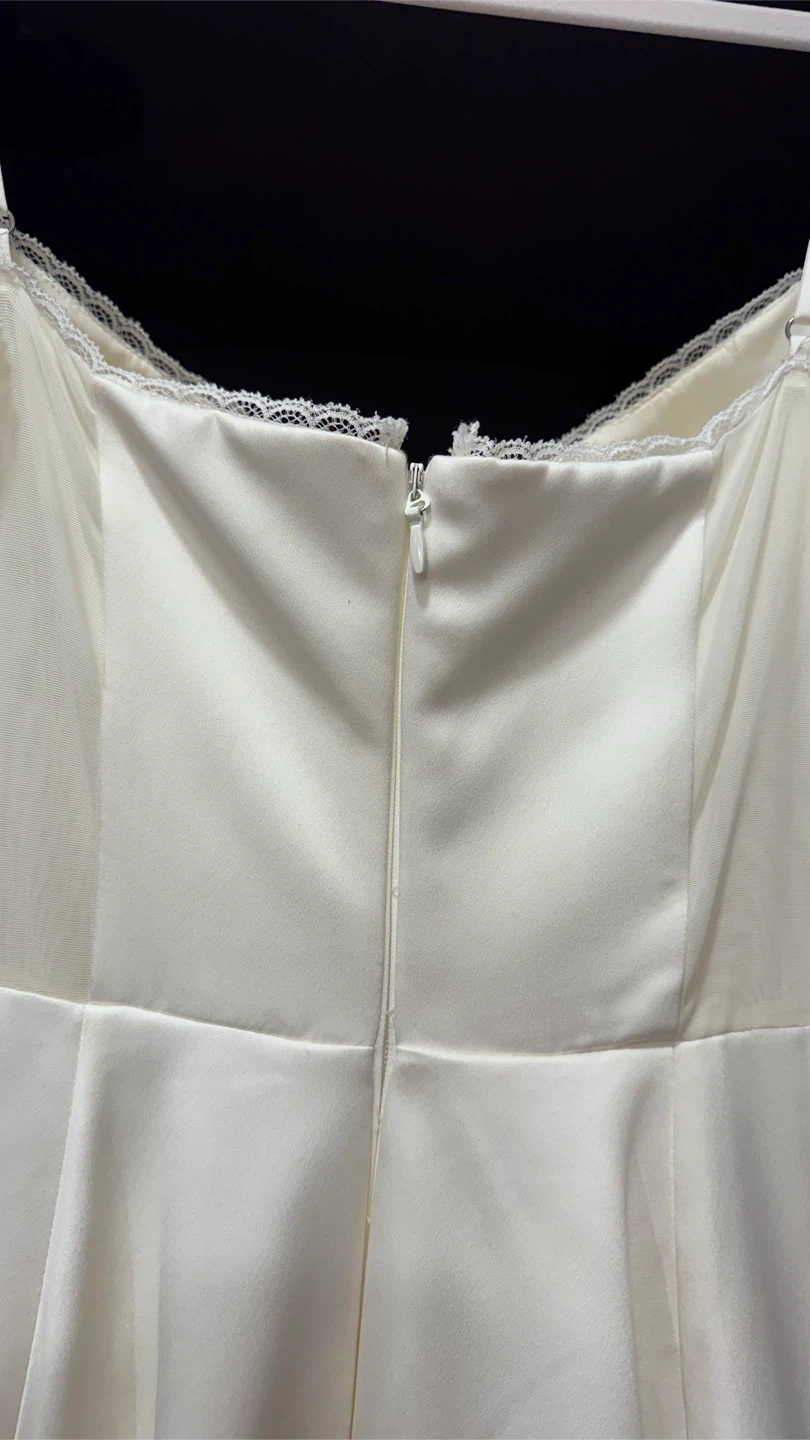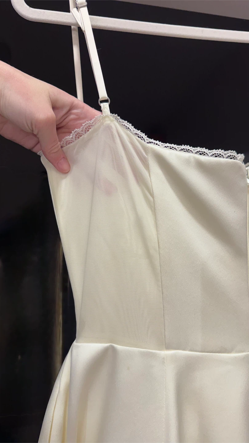 Details: Soft ivory tone, minimal stretch, fully lined for comfort, adjustable straps, zip-up back, pockets (!), comes in original box.