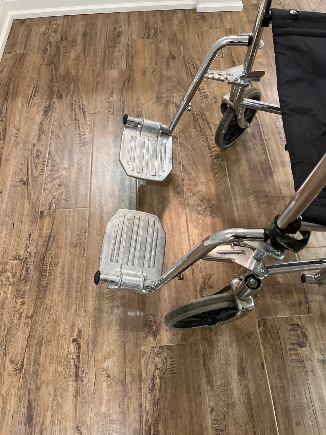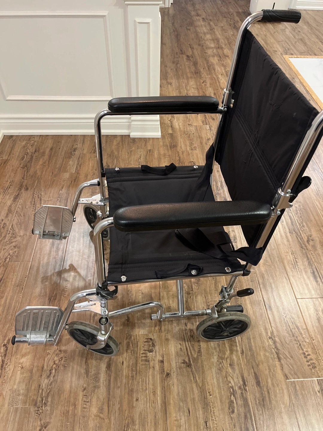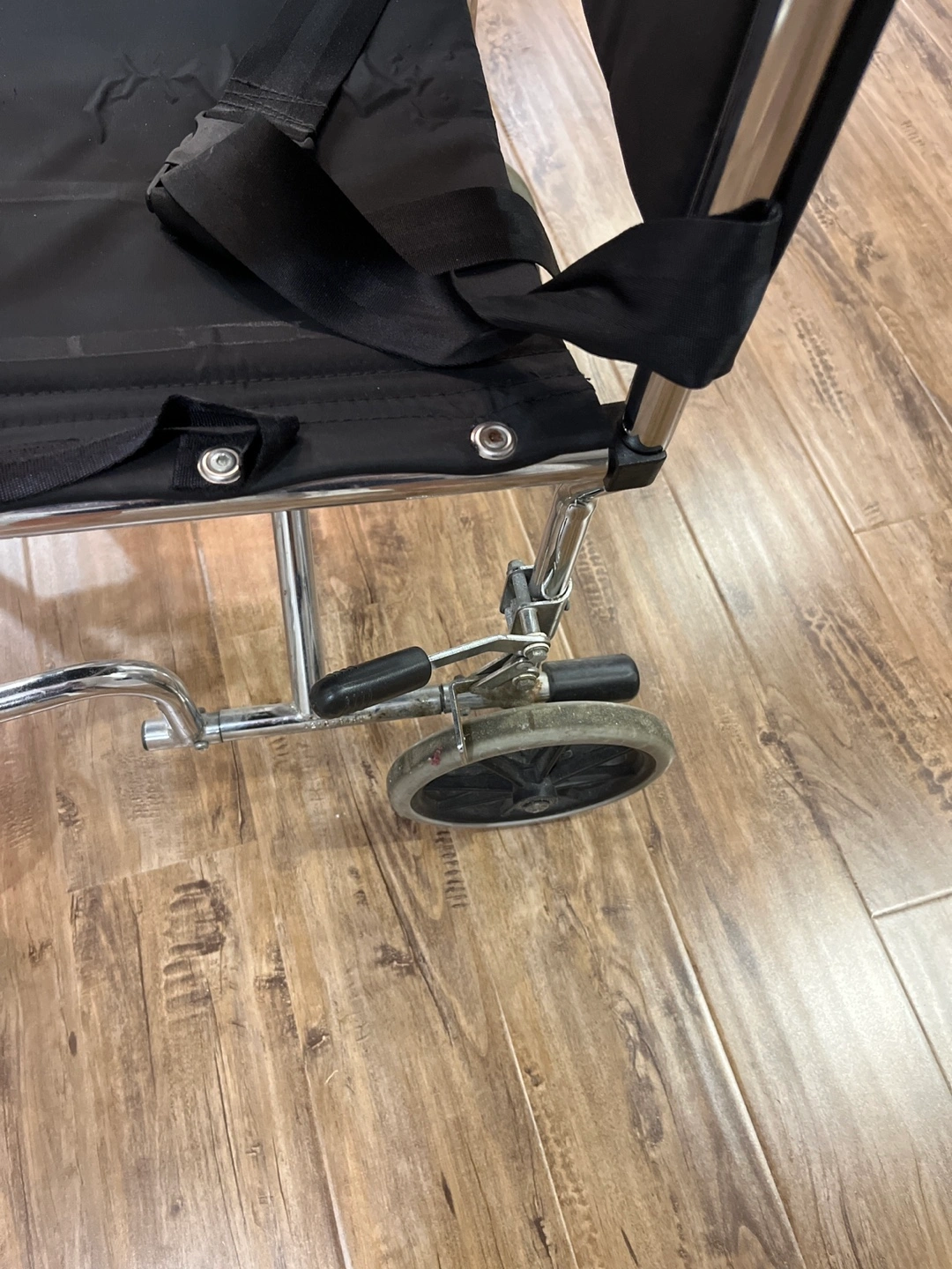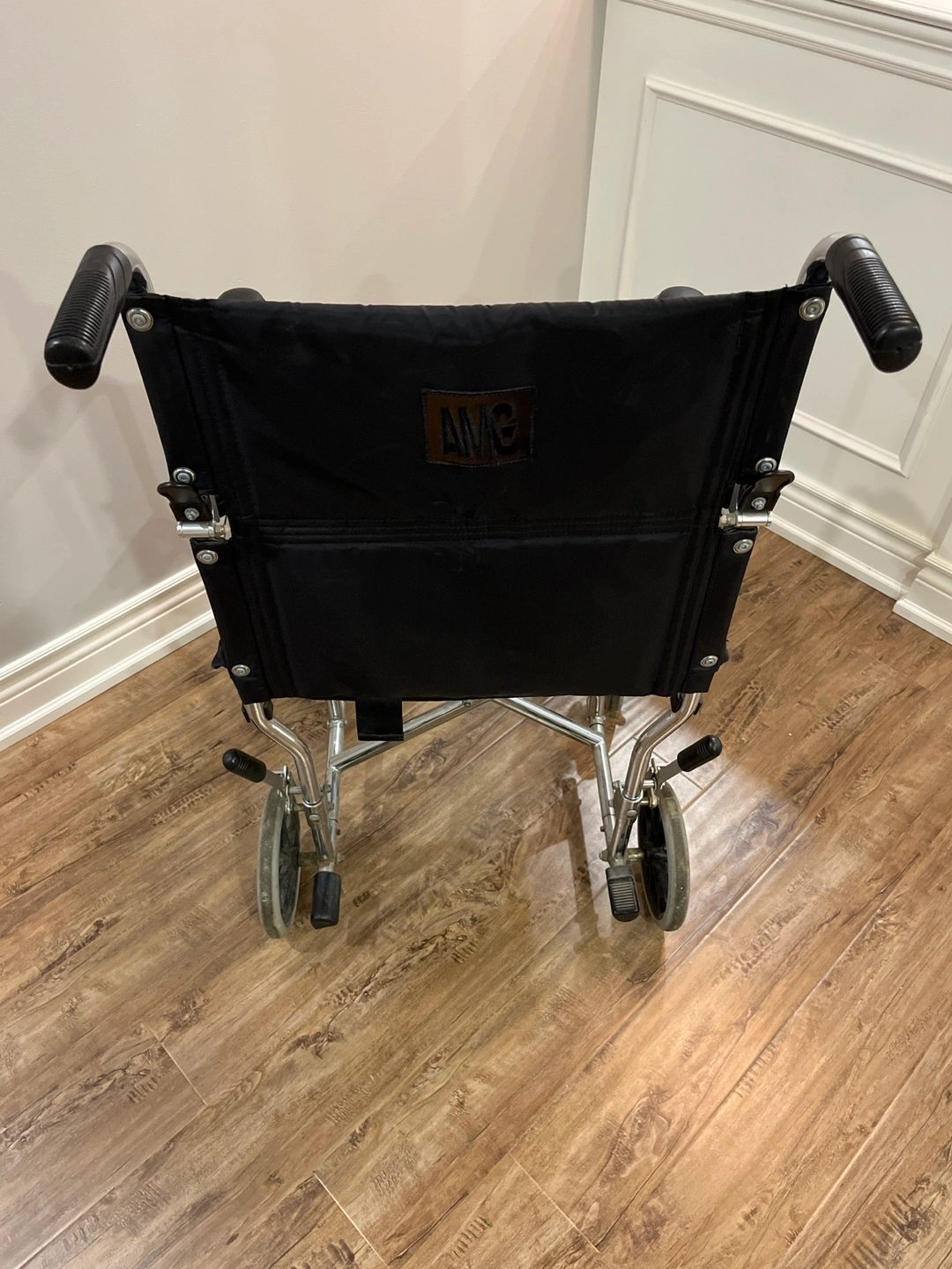 Selling a used AMG wheelchair. It has a silver frame and a black seat. The wheelchair shows signs of wear from normal use, but it's still in good working condition. Perfect for someone who needs mobility assistance.