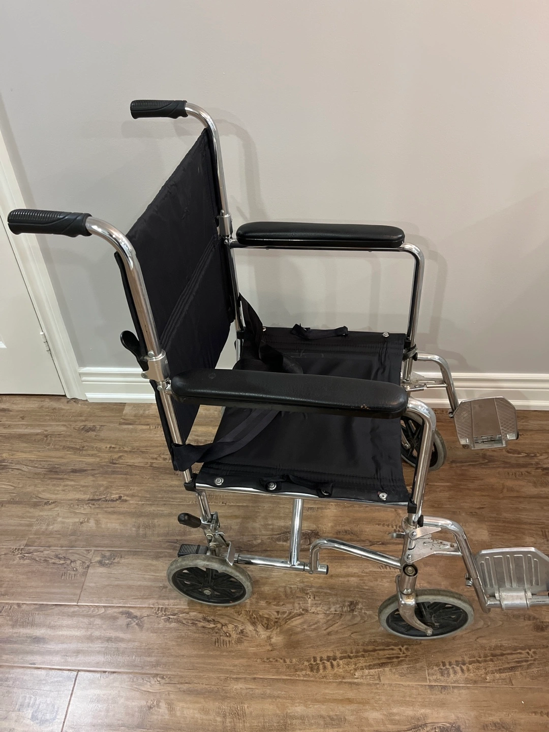 Selling a used AMG wheelchair. It has a silver frame and a black seat. The wheelchair shows signs of wear from normal use, but it's still in good working condition. Perfect for someone who needs mobility assistance.
