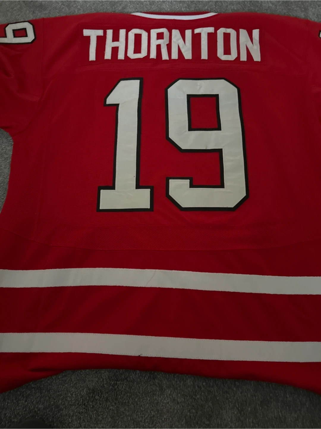 Selling a Nike Team Canada hockey jersey in size medium. It's red with white stripes and features the iconic maple leaf logo on the front. The back has "Thornton" and the number 19. A great piece for any hockey fan!